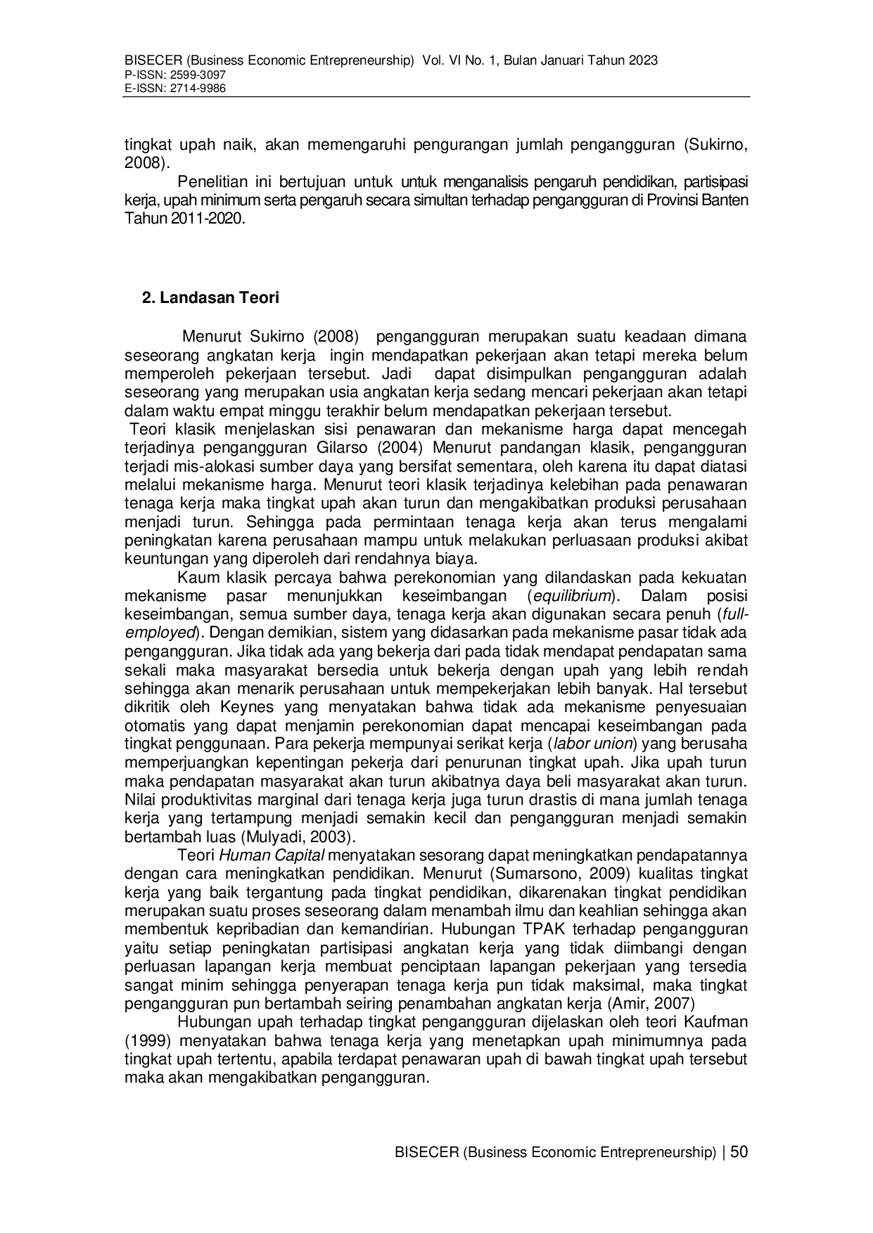 BISECER (Business Economic Entrepreneurship)BISECER (Business Economic Entrepreneurship)Masalah ekonomi yang terjadi pada Provinsi Banten adalah sempitnya kesempatan kerja sehingga berdampak pada meningkatnya pengangguran. Banten memiliki tingkat tertinggi dibandingkan 6 provinsi di Pulau Jawa. Tingginya angka pengangguran di Provinsi Banten dapat menghambat pembangunan ekonomi. Penelitian ini bertujuan untuk menganalisis pengaruh pendidikan, partisipasi kerja, upah minimum terhadap pengangguran serta mengetahui secara bersama‑sama (simultan) terhadap pengangguran di Provinsi Banten. Penelitian ini merupakan penelitian kuantitatif dengan menggunakan data sekunder yang didapatkan dari publikasi BPS Banten. Metode analisis yang digunakan dalam penelitian ini adalah Analisis Regresi Data Panel dengan metode Fixed Effect Model (FEM) dengan waktu penelitian 2011‑2020. Hasil Analisis Regresi Data Panel dengan metode Fixed Effect Model (FEM) menunjukkan bahwa variabel pendidikan berpengaruh negatif dan tidak signifikan, variabel partisipasi kerja berpengaruh positif dan tidak signifikan, variabel upah berpengaruh negatif dan signifikan terhadap pengangguran Provinsi Banten Tahun 2011‑2020. Dan dapat disimpulkan bahwa secara simultan variabel pendidikan, partisipasi kerja, dan upah mempunyai pengaruh yang signifikan terhadap tingkat pengangguran di Provinsi Banten tahun 2011‑2020.