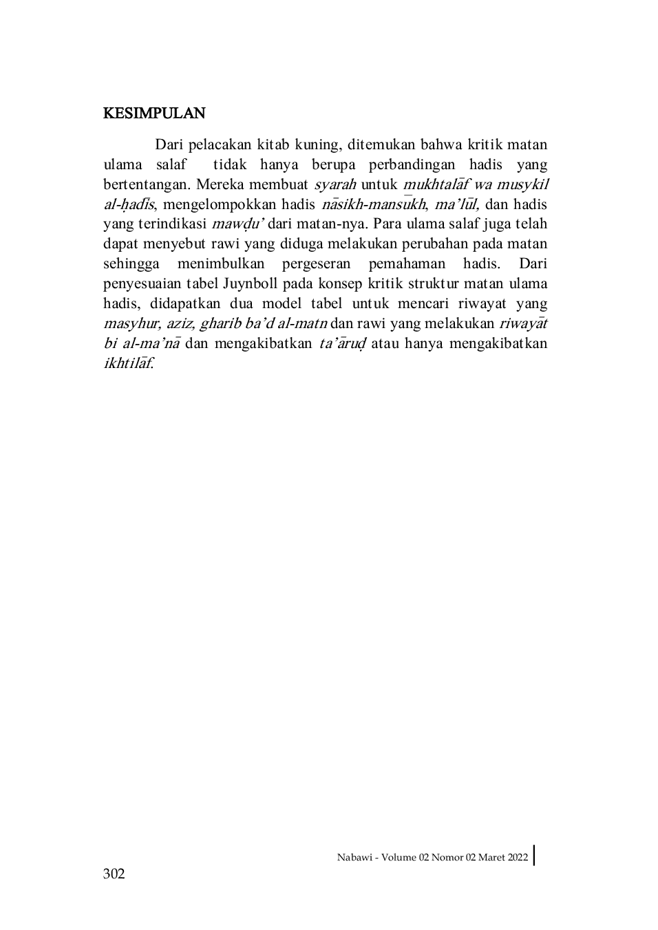 Nabawi: Journal of Hadith StudiesNabawi: Journal of Hadith StudiesDistingsi penelitian kritik matan tidak begitu jelas dalam beberapa artikel jurnal karena terlihat tidak beda dengan penelitian fiqh al-hadits. Disamping itu, artikel yang membahas metode kritik struktur matan tidak mudah didapat. Penelitian ini membahas macam bentuk kritik matan dalam kitab ilmu hadis klasik dan kontemporer. Kemudian pembahasan dilanjutkan dengan metode kritik matan untuk mencari rawi penyebab perubahan lafal hadis atau pergeseran maknaya. Hasilnya, Ulama salaf telah lakukan kritik matan hadi