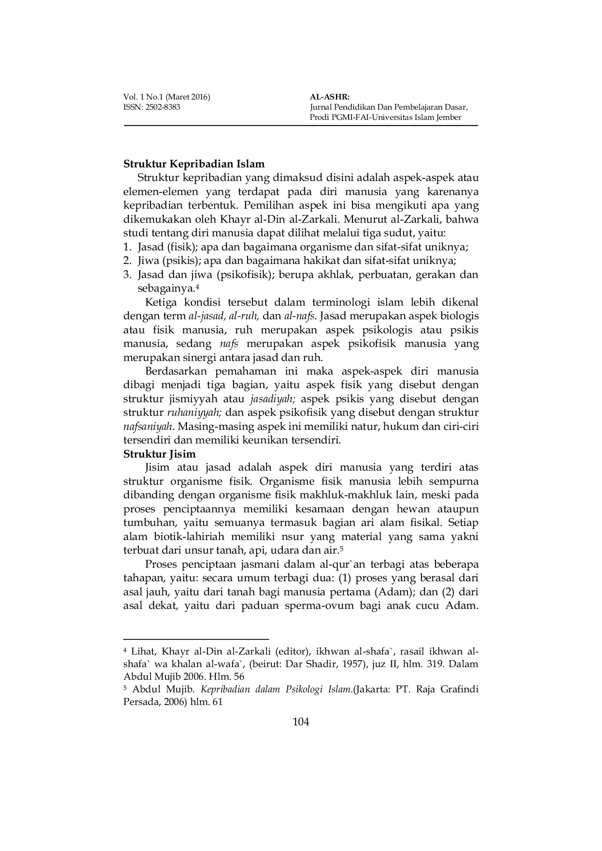 Al-Ashr : Jurnal Pendidikan dan Pembelajaran DasarAl-Ashr : Jurnal Pendidikan dan Pembelajaran DasarFenomena perkembangan abad mutakhir menghendaki adanya suatu sistem pendidikan yang komprehensif. Karena perkembangan masyarakat dewasa ini menghendaki adanya pembinaan peserta didik yang dilaksanakan secara seimbang antara nilai dan sikap, pengetahuan, kecerdasan, keterampilan, kemampuan komunikasi dan kesadaran akan ekologi lingkungan. Dengan kata lain, seimbang antara iptek dan imtaq. Untuk mewujudkan kemajuan di bidang iptek manusia perlu mengasah dan mengembangkan potensi akalnya yaitu mengasah kecerdasan intelektualnya iq (intelektual quotient), sedangkan untuk mewujudkan imtaq ia harus mengasah potensi eq (emotional quotient), dan sq (spiritual quotient) yang ada di dalam dirinya. Penelitian ini menggunakan pendekatan penelitian kualitatif. Jenis penelitian library research. Sedangkan metode pengumpulan data dilakukan dengan study dokumentasi. Di analisis dengan reduksi data, display data, dan verifikasi data. Keabsahan data dicapai dengan menggunakan triangulasi dan pengamatan secara tekun. Hasil penelitian ini adalah esq model adalah sebuah mekanisme sistematis untuk mengatur ketiga dimensi manusia, yaitu body, mind dan soul atau dimensi fisik, mental dan spiritual dalam satu kesatuan yang integral. Sederhananya, esq berbicara tentang bagaimana mengatur tiga komponen utama, yaitu iman, islam dan ihsan dalam keselarasan dan kesatuan tauhid.