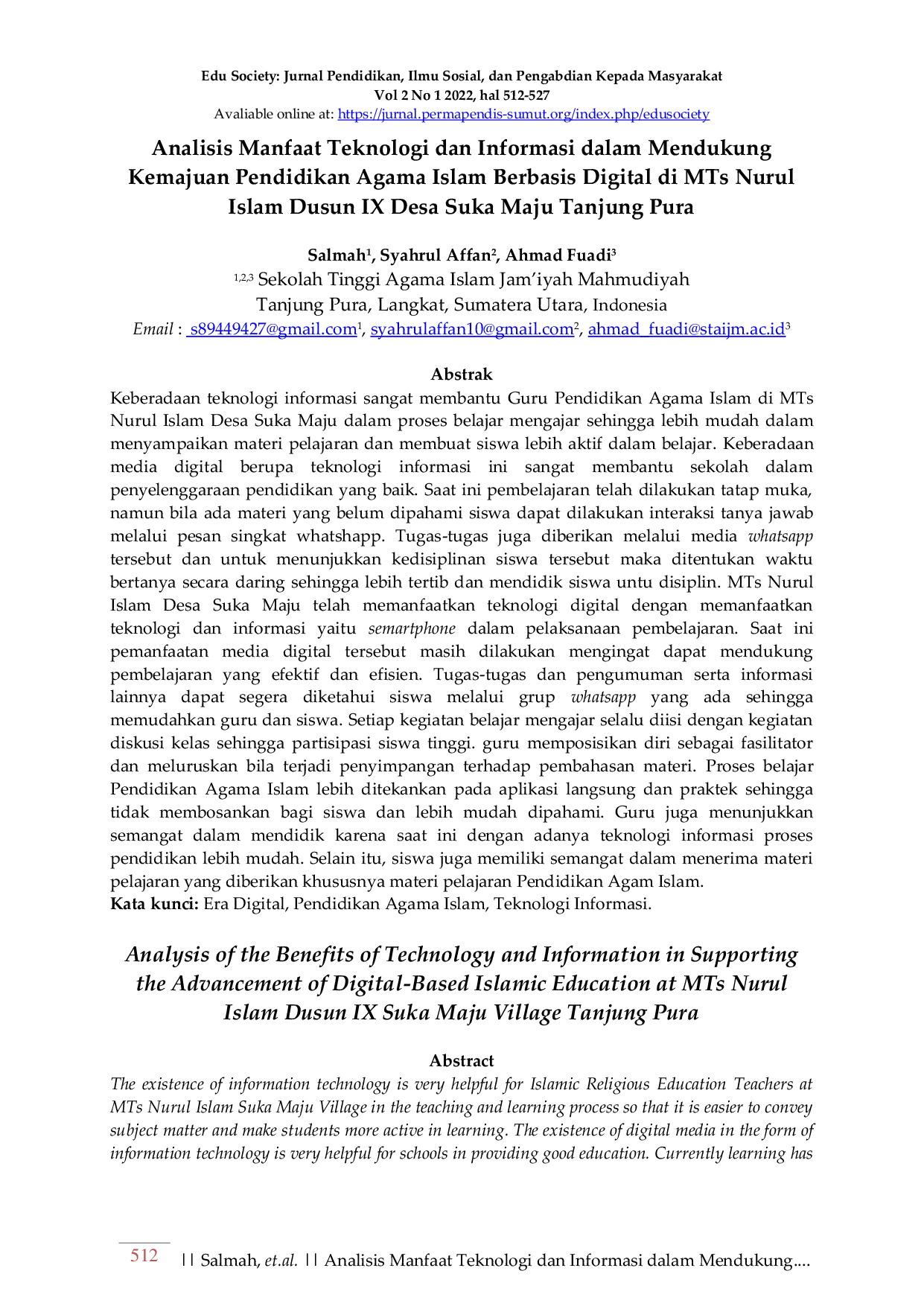 EDU SOCIETY: JURNAL PENDIDIKAN, ILMU SOSIAL DAN PENGABDIAN KEPADA MASYARAKATEDU SOCIETY: JURNAL PENDIDIKAN, ILMU SOSIAL DAN PENGABDIAN KEPADA MASYARAKATKeberadaan teknologi informasi sangat membantu guru Pendidikan Agama Islam di MTs Nurul Islam Desa Suka Maju dalam proses belajar mengajar sehingga lebih mudah dalam menyampaikan materi pelajaran dan membuat siswa lebih aktif dalam belajar. Keberadaan media digital berupa teknologi informasi ini sangat membantu sekolah dalam penyelenggaraan pendidikan yang baik. Saat ini pembelajaran telah dilakukan tatap muka, namun bila ada materi yang belum dipahami siswa dapat dilakukan interaksi tanya jawab melalui pesan singkat WhatsApp. Tugas-tugas juga diberikan melalui media WhatsApp tersebut dan untuk menunjukkan kedisiplinan siswa maka ditentukan waktu bertanya secara daring sehingga lebih tertib dan mendidik siswa untuk disiplin. MTs Nurul Islam Desa Suka Maju telah memanfaatkan teknologi digital dengan memanfaatkan teknologi dan informasi yaitu smartphone dalam pelaksanaan pembelajaran. Saat ini pemanfaatan media digital tersebut masih dilakukan mengingat dapat mendukung pembelajaran yang efektif dan efisien. Tugas-tugas dan pengumuman serta informasi lainnya dapat segera diketahui siswa melalui grup WhatsApp yang ada sehingga memudahkan guru dan siswa. Setiap kegiatan belajar mengajar selalu diisi dengan kegiatan diskusi kelas sehingga partisipasi siswa tinggi. Guru memposisikan diri sebagai fasilitator dan meluruskan bila terjadi penyimpangan terhadap pembahasan materi. Proses belajar Pendidikan Agama Islam lebih ditekankan pada aplikasi langsung dan praktik sehingga tidak membosankan bagi siswa dan lebih mudah dipahami. Guru juga menunjukkan semangat dalam mendidik karena saat ini dengan adanya teknologi informasi proses pendidikan lebih mudah. Selain itu, siswa juga memiliki semangat dalam menerima materi pelajaran yang diberikan khususnya materi pelajaran Pendidikan Agama Islam.