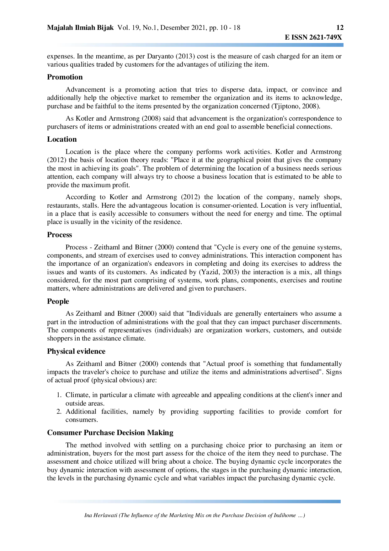 Majalah Ilmiah BijakMajalah Ilmiah BijakPenelitian ini dilakukan untuk mengetahui pengaruh pemasaran campuran terhadap keputusan pembelian IndiHome PT. Telkom di Kota Bogor. Variabel penelitian terdiri dari variabel independen yaitu produk, harga, lokasi, dan promosi, sedangkan variabel dependennya adalah keputusan pembelian IndiHome PT. Telkom di Kota Bogor. Metode penelitian yang digunakan adalah kuantitatif kausalitas. Analisis data menggunakan regresi linier multiple dan uji determinasi. Hasil menunjukkan pengaruh signifikan dari lokasi, proses, karyawan, dan bukti fisik terhadap keputusan pembelian.