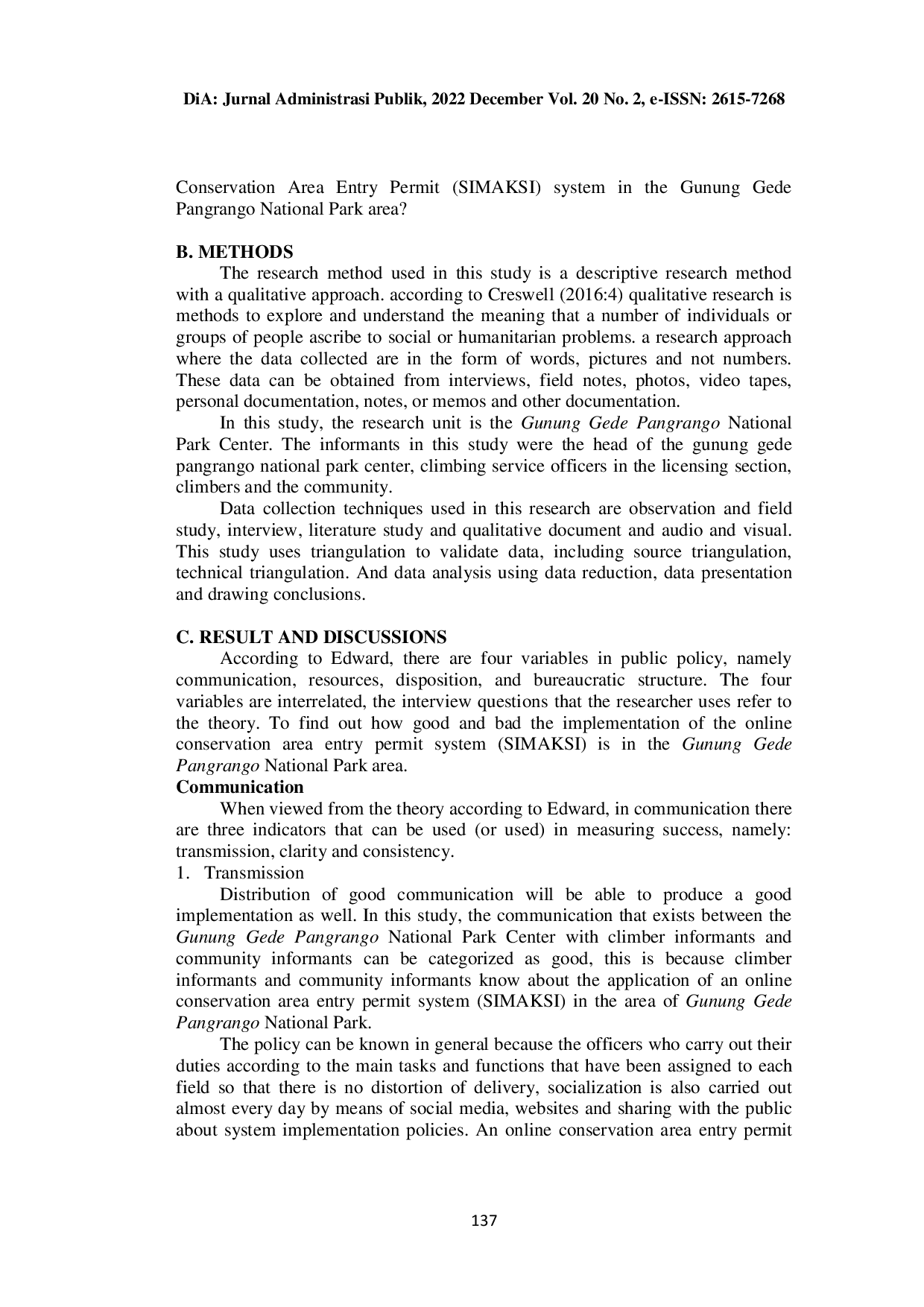 DIA: Jurnal Administrasi PublikDIA: Jurnal Administrasi PublikPenelitian ini bertujuan menganalisis implementasi sistem pemberian izin masuk kawasan konservasi (SIMAKSI) online di Taman Nasional Gunung Gede Pangrango. Penelitian menggunakan metode deskriptif kualitatif melalui observasi, wawancara, studi dokumentasi, dan triangulasi sumber dan teknik. Hasil menunjukkan bahwa pihak taman nasional telah melakukan sosialisasi kebijakan SIMAKSI, sumber daya seperti SDM dan infrastruktur cukup memadai, tetapi masih terjadi pelanggaran izin oleh pendaki ilegal. Sistem SIMAKSI berdampak positif pada penataan administrasi dan peningkatan basis data pengunjung, meskipun tantangan implementasi tetap terjadi.