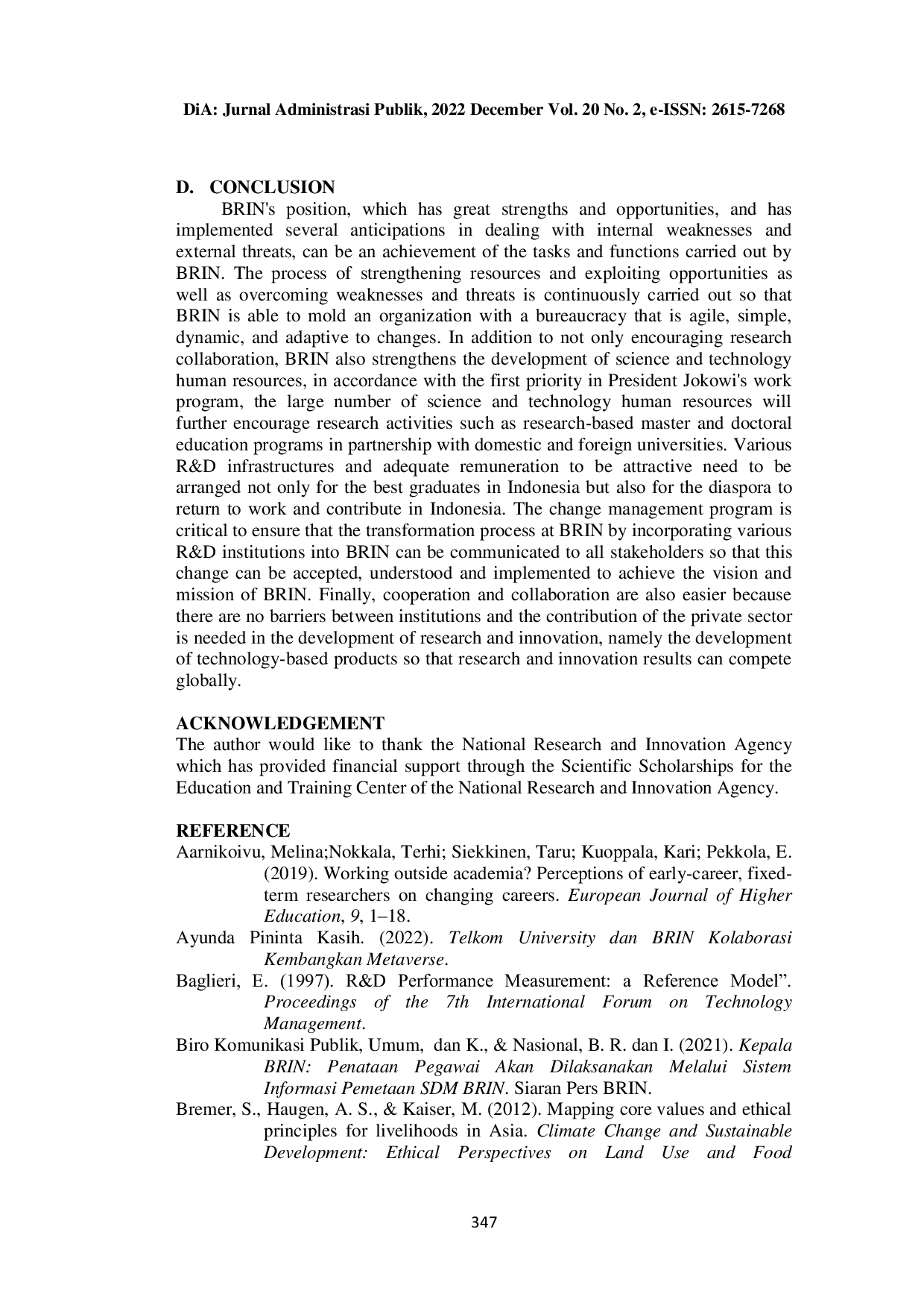 Posisi BRIN yang memiliki kekuatan dan peluang yang besar, serta telah menerapkan beberapa antisipasi dalam menghadapi kelemahan internal dan ancaman eksternal, dapat menjadi pencapaian dalam tugas dan fungsi yang dilakukan oleh BRIN.Proses penguatan sumber daya dan memanfaatkan peluang serta mengatasi kelemahan dan ancaman terus dilakukan agar BRIN dapat membentuk organisasi dengan birokrasi yang gesit, sederhana, dinamis, dan adaptif terhadap perubahan.Selain mendorong kolaborasi penelitian, BRIN juga memperkuat pengembangan sumber daya manusia ilmu pengetahuan dan teknologi, sesuai dengan prioritas pertama dalam program kerja Presiden Jokowi, yaitu banyaknya sumber daya manusia ilmu pengetahuan dan teknologi akan semakin mendorong kegiatan penelitian seperti program pendidikan magister dan doktoral berbasis penelitian bekerja sama dengan universitas dalam negeri dan luar negeri.Berbagai infrastruktur R&D dan remunerasi yang memadai untuk menjadi menarik perlu diatur tidak hanya untuk lulusan terbaik di Indonesia tetapi juga untuk diaspora untuk kembali bekerja dan berkontribusi di Indonesia.Program manajemen perubahan sangat kritis untuk memastikan proses transformasi di BRIN dengan menggabungkan berbagai institusi R&D ke dalam BRIN dapat dikomunikasikan kepada semua pemangku kepentingan sehingga perubahan ini dapat diterima, dipahami, dan diimplementasikan untuk mencapai visi dan misi BRIN.Akhirnya, kerjasama dan kolaborasi juga lebih mudah karena tidak ada hambatan antara institusi dan kontribusi sektor swasta diperlukan dalam pengembangan penelitian dan inovasi, yaitu pengembangan produk berbasis teknologi sehingga hasil penelitian dan inovasi dapat bersaing secara global.