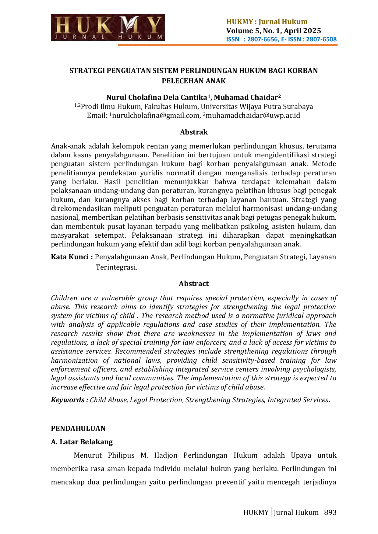 HUKMY : Jurnal HukumHUKMY : Jurnal HukumAnak-anak adalah kelompok rentan yang memerlukan perlindungan khusus, terutama dalam kasus penyalahgunaan. Penelitian ini bertujuan untuk mengidentifikasi strategi penguatan sistem perlindungan hukum bagi korban penyalahgunaan anak. Metode penelitiannya pendekatan yuridis normatif dengan menganalisis terhadap peraturan yang berlaku. Hasil penelitian menunjukkan bahwa terdapat kelemahan dalam pelaksanaan undang-undang dan peraturan, kurangnya pelatihan khusus bagi penegak hukum, dan kurangnya akses bagi korban terhadap layanan bantuan. Strategi yang direkomendasikan meliputi penguatan peraturan melalui harmonisasi undang-undang nasional, memberikan pelatihan berbasis sensitivitas anak bagi petugas penegak hukum, dan membentuk pusat layanan terpadu yang melibatkan psikolog, asisten hukum, dan masyarakat setempat. Pelaksanaan strategi ini diharapkan dapat meningkatkan perlindungan hukum yang efektif dan adil bagi korban penyalahgunaan anak.
