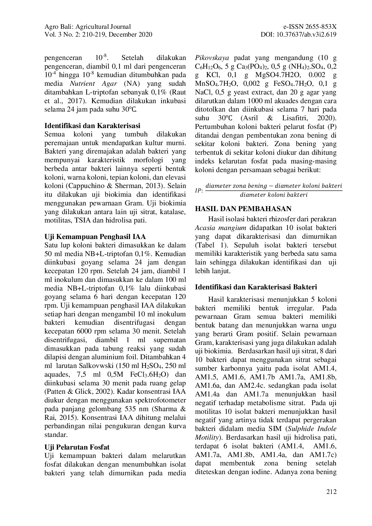 Agro Bali : Agricultural JournalAgro Bali : Agricultural JournalIAA adalah produk paling umum dari metabolisme L-triptofan yang dapat diproduksi oleh beberapa mikroorganisme. Beberapa mikroorganisme yang memiliki potensi menghasilkan IAA adalah bakteri rhizosfer pada tanaman Leguminosae, salah satunya adalah akasia. Acacia mangium, juga dikenal sebagai akasia, adalah pohon yang tumbuh cepat. Namun, akasia adalah tanaman invasif. Tanaman akasia memiliki bintil yang merupakan hasil simbiosis akar tanaman dan bakteri. Simbiosis ini dapat mempengaruhi kesuburan tanah. Banyak potensi yang dapat digali dari bakteri tanah, khususnya di rhizosfer. Tujuan dari penelitian ini adalah untuk mengisolasi dan mengidentifikasi bakteri pada rizosfer tanaman akasia yang mampu menghasilkan IAA sebagai salah satu potensi untuk kandidat PGPR (Plant Growth Promoting Rhizobacteria). Metode yang digunakan meliputi pengambilan sampel, isolasi bakteri penghasil IAA, pemurnian bakteri, identifikasi bakteri dan uji biokimia, pembuatan kurva tumbuh bakteri, dan uji isolat bakteri pelarut fosfat. Hasil isolasi bakteri rhizosfer diperoleh sebanyak 10 isolat bakteri yang memiliki karakteristik berbeda secara morfologi. Berdasarkan hasil identifikasi bakteri berdasarkan pewarnaan Gram, bakteri tersebut masuk ke dalam genus Bacillus dan terdapat 5 isolat bakteri yang memiliki kemampuan menghasilkan IAA dan melarutkan fosfat sehingga bakteri tersebut memiliki potensi sebagai pupuk hayati.
