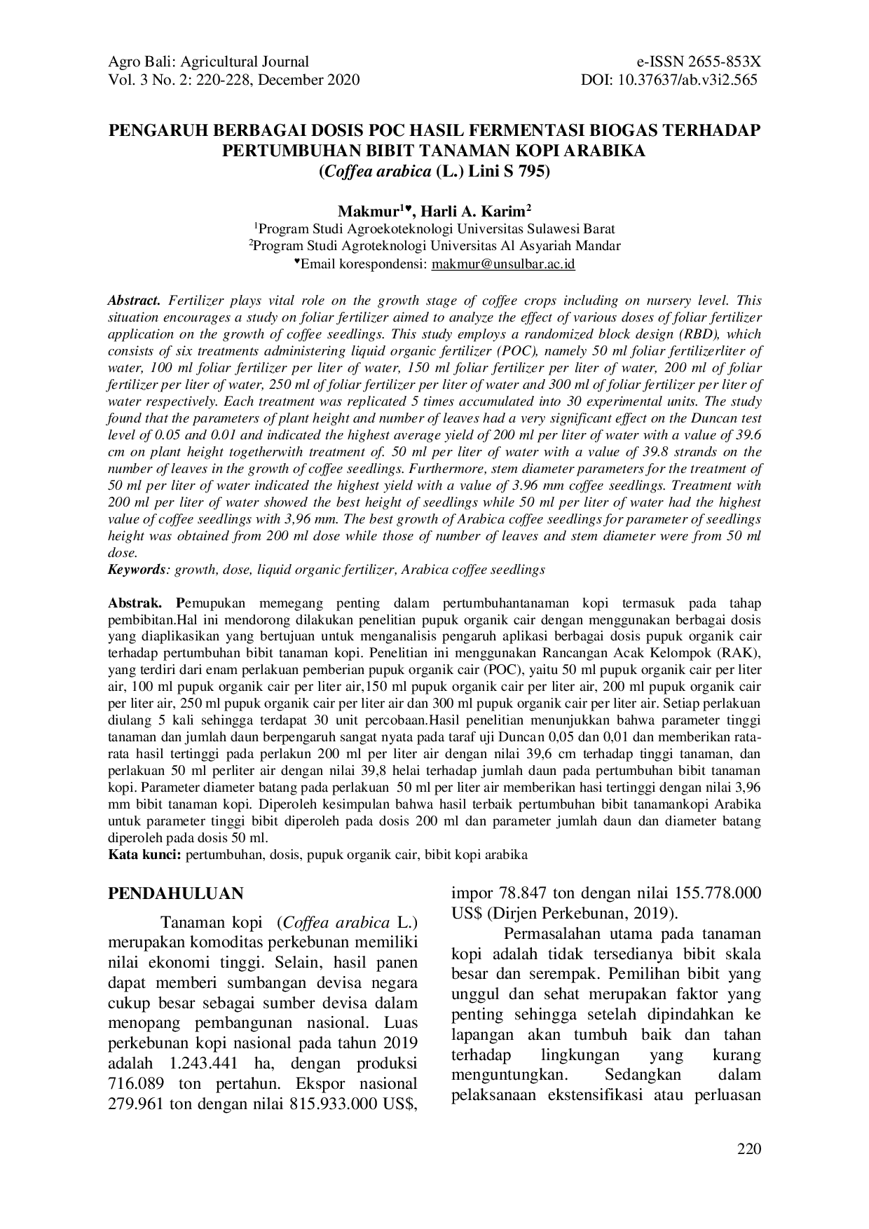 Agro Bali : Agricultural JournalAgro Bali : Agricultural JournalPemupukan memegang peranan penting dalam pertumbuhan tanaman kopi, termasuk pada tahap pembibitan. Hal ini mendorong dilakukan penelitian pupuk organik cair dengan menggunakan berbagai dosis yang diaplikasikan yang bertujuan untuk menganalisis pengaruh aplikasi berbagai dosis pupuk organik cair terhadap pertumbuhan bibit tanaman kopi. Penelitian ini menggunakan Rancangan Acak Kelompok (RAK), yang terdiri dari enam perlakuan pemberian pupuk organik cair (POC), yaitu 50 ml pupuk organik cair per liter air, 100 ml pupuk organik cair per liter air, 150 ml pupuk organik cair per liter air, 200 ml pupuk organik cair per liter air, 250 ml pupuk organik cair per liter air dan 300 ml pupuk organik cair per liter air. Setiap perlakuan diulang 5 kali sehingga terdapat 30 unit percobaan. Hasil penelitian menunjukkan bahwa parameter tinggi tanaman dan jumlah daun berpengaruh sangat nyata pada taraf uji Duncan 0,05 dan 0,01 dan memberikan rata-rata hasil tertinggi pada perlakuan 200 ml per liter air dengan nilai 39,6 cm terhadap tinggi tanaman, dan perlakuan 50 ml per liter air dengan nilai 39,8 helai terhadap jumlah daun pada pertumbuhan bibit tanaman kopi. Parameter diameter batang pada perlakuan 50 ml per liter air memberikan hasil tertinggi dengan nilai 3,96 mm bibit tanaman kopi. Diperoleh kesimpulan bahwa hasil terbaik pertumbuhan bibit tanaman kopi Arabika untuk parameter tinggi bibit diperoleh pada dosis 200 ml dan parameter jumlah daun dan diameter batang diperoleh pada dosis 50 ml.