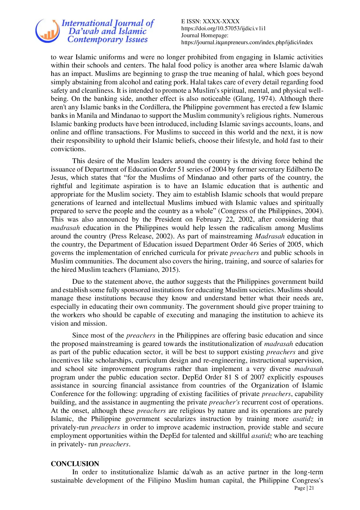 International Journal of Da’wah and Islamic Contemporary IssuesInternational Journal of Da’wah and Islamic Contemporary IssuesThis paper examines the future of Islamic dawah (outreach) in the secular state of the Philippines, where Islam is practiced by a minority within a predominantly Christian society governed by a constitutional separation of religion and state. The study explores how Islamic dawah can adapt to the countrys socio-political landscape, with a particular focus on the role of Muslim leaders and organizations in promoting social community development. Utilizing a combination of literature review, case studies, and interviews with Islamic leaders, the research identifies both opportunities and challenges in conducting dawah within a secular framework. The findings highlight the need for a contextualized approach that aligns with Islamic principles while respecting the secular nature of the state. While secularism may impose limitations on traditional forms of dawah, it also provides avenues for addressing societal issues such as poverty, education, and social harmony. Ultimately, the study proposes a model of dawah that fosters peaceful coexistence and inclusive development within the secular Philippine context.