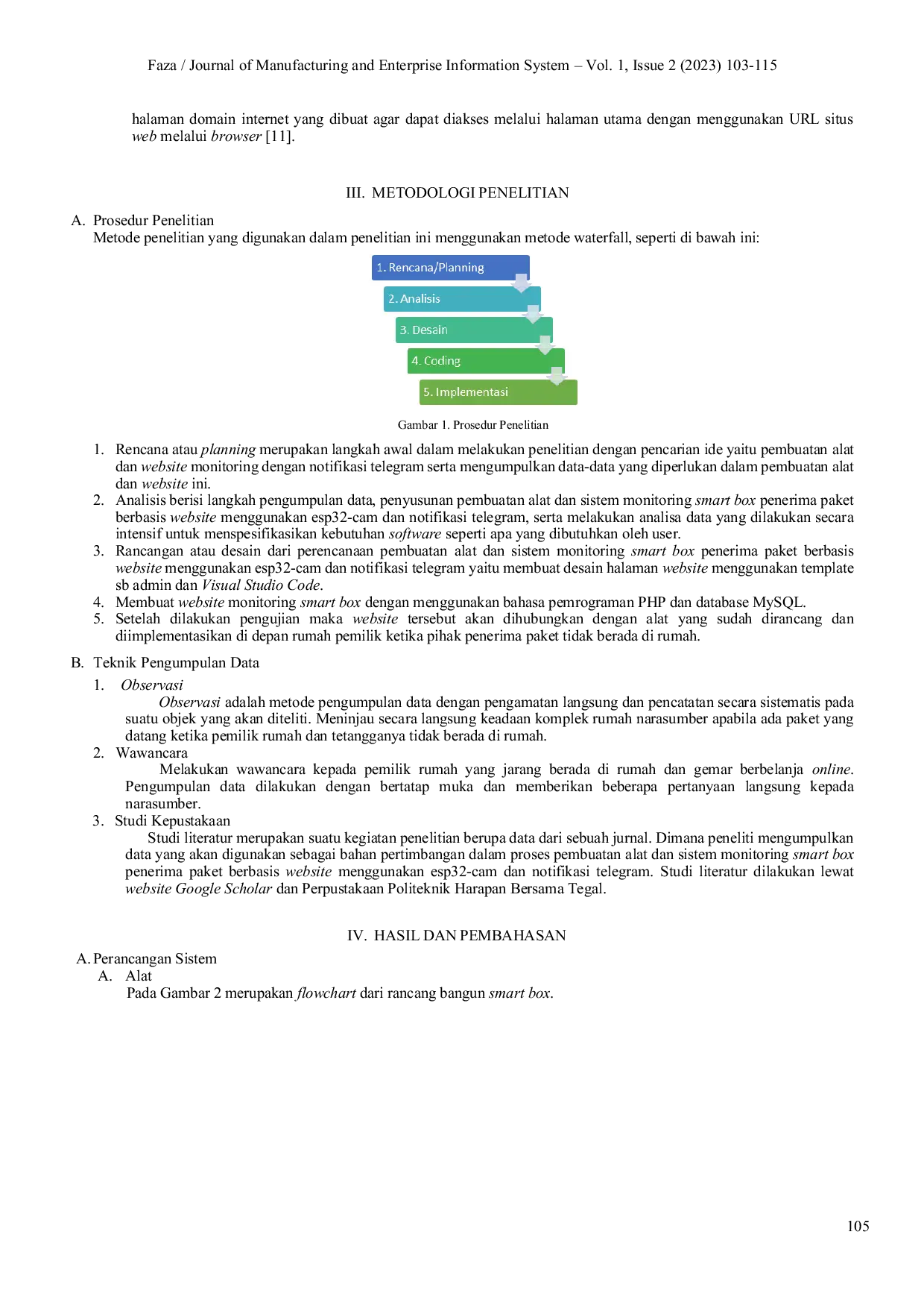 Journal of Manufacturing and Enterprise Information SystemJournal of Manufacturing and Enterprise Information SystemBidang ekonomi menciptakan konsep jual beli online atau yang sebut juga e-commerce. Dalam hal ini, meningkatnya jasa jual beli online juga berdampak pada perusahaan jasa pengiriman baik mengirim barang maupun menerima barang. Tidak lepas dari masalah yang terjadi dalam proses pengiriman barang, masalah yang seringkali terjadi ketika pihak penerima paket tidak berada di rumah. Pada kasus ini, tindakan yang biasa dilakukan kurir seperti menitipkan paket ke tetangga terdekat. Namun, jika tetangganya juga tidak ada di rumah, maka paket akan diantar keesokan harinya. Tujuan dari penelitian ini adalah membuat rancang bangun dan website sistem monitoring smart box penerima paket dengan Esp32-Cam dan notifikasi telegram, sehingga dengan adanya alat ini ketika pemilik rumah sedang tidak berada di rumah maka secara otomatis alat akan menerima paket dan mengirimkan notifikasi melalui telegram dari jarak jauh serta dapat dimonitoring melalui website. Metode penelitian yang digunakan dalam penelitian ini menggunakan metode waterfall. Sumber data diperoleh melalui observasi, wawancara, studi kepustakaan, dan studi dokumentasi. Rancang bangun ini dirancang dengan beberapa komponen hardware yaitu terdapat esp32-cam dan esp8266 sebagai modul utama yang terdapat pada rancang bangun, serta terdapat sensor magnetik, keypad, selenoid, dan lainnya sebagai komponen pelengkap. Website ini menggunakan bahasa pemrograman Hypertext Preprocessor (PHP) dan MySQL sebagai database untuk menyimpan data.