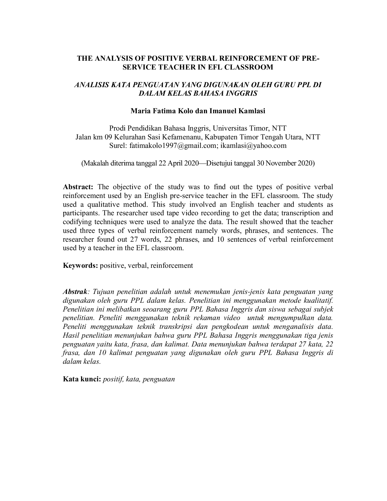 Jurnal BébasanJurnal BébasanTujuan penelitian adalah untuk menemukan jenis-jenis kata pengayaan yang digunakan oleh guru PPL dalam kelas. Penelitian ini menggunakan metode kualitatif. Penelitian ini melibatkan seorang guru PPL Bahasa Inggris dan siswa sebagai subjek penelitian. Peneliti menggunakan teknik rekaman video untuk mengumpulkan data. Peneliti menggunakan teknik transkripsi dan pengkodean untuk menganalisis data. Hasil penelitian menunjukkan bahwa guru PPL Bahasa Inggris menggunakan tiga jenis penguatan yaitu kata, frasa, dan kalimat. Data menunjukkan bahwa terdapat 27 kata, 22 frasa, dan 10 kalimat penguatan yang digunakan oleh guru PPL Bahasa Inggris di dalam kelas.