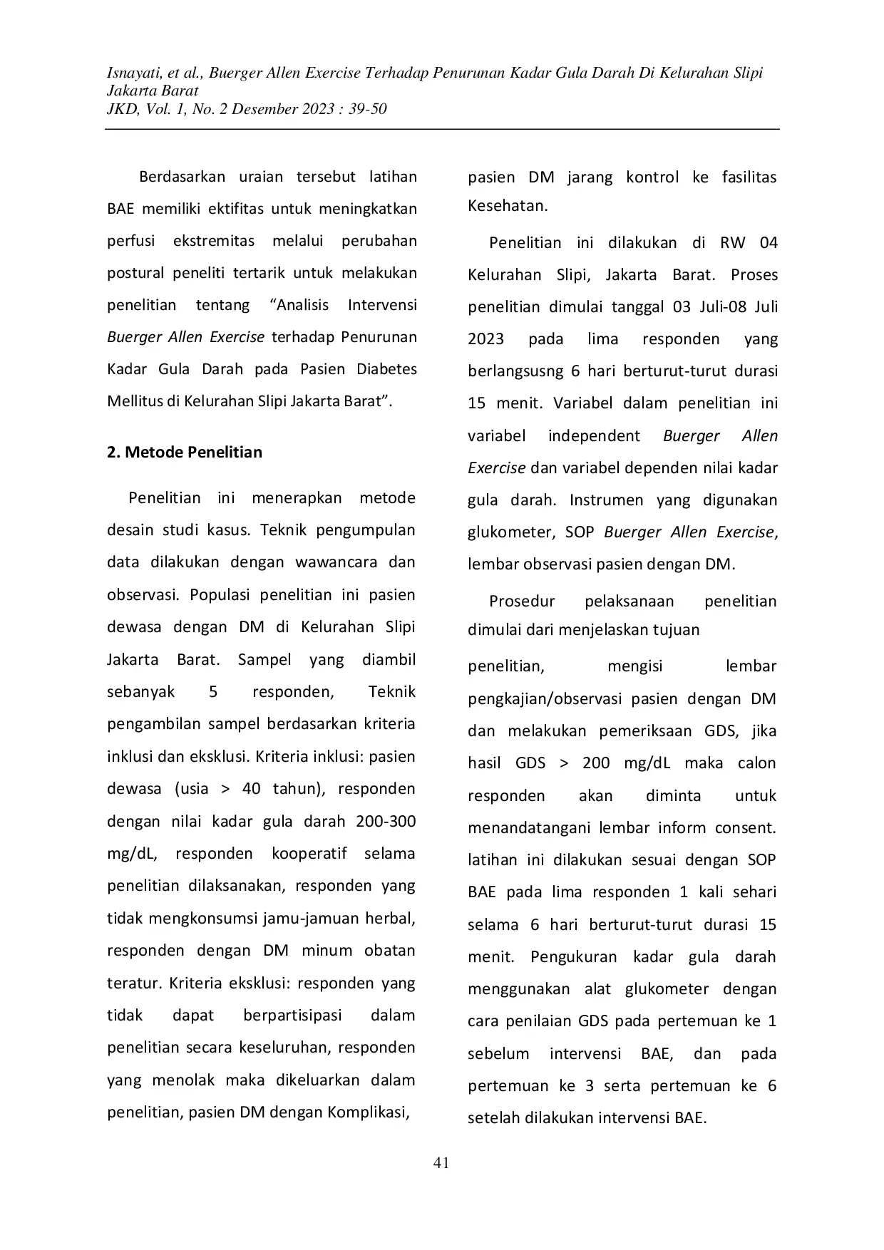 Berdasarkan penelitian ini, intervensi Buerger Allen Exercise (BAE) menunjukkan hasil penurunan kadar gula darah pada pasien diabetes mellitus di Kelurahan Slipi Jakarta Barat.Rata-rata usia responden adalah 59 tahun, dengan karakteristik meliputi jenis kelamin perempuan, pekerjaan ibu rumah tangga atau wirausaha, dan tingkat pendidikan SD atau SMA.Penelitian ini merekomendasikan penerapan BAE sebagai upaya non-farmakologis untuk membantu mengendalikan kadar gula darah pada pasien diabetes mellitus.