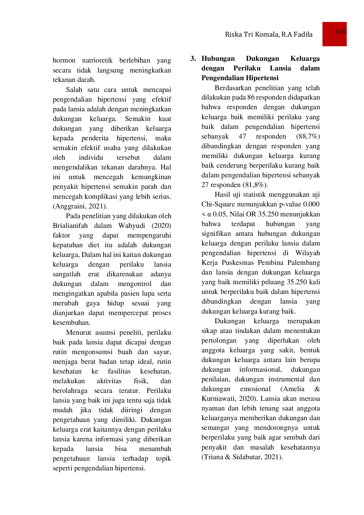 Hasil penelitian menunjukkan bahwa mayoritas responden lansia yang memiliki dukungan keluarga baik juga memiliki perilaku pengendalian hipertensi yang baik.Tambahannya, tersedianya hubungan signifikan antara dukungan keluarga dengan perilaku lansia dalam pengendalian hipertensi dengan nilai p-value 0,000 < 0,05.