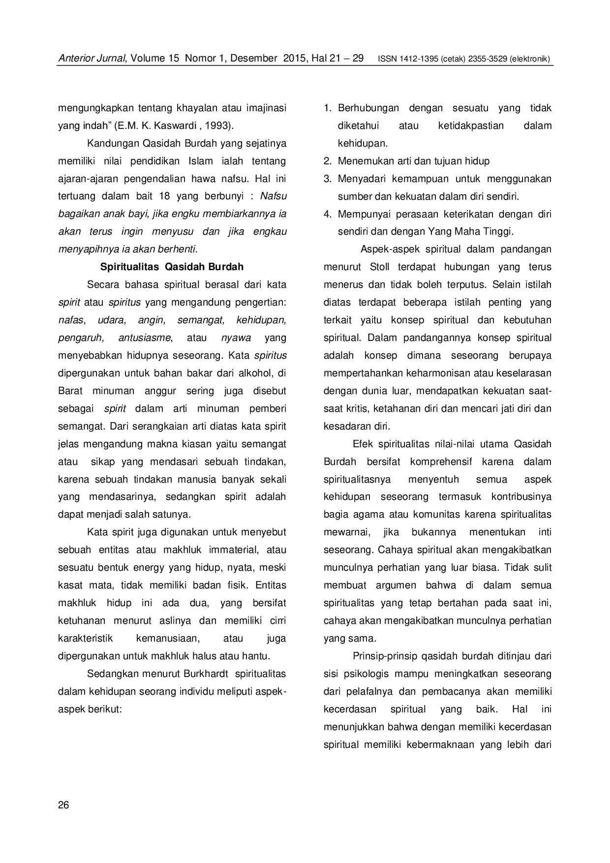 Anterior JurnalAnterior JurnalSeseorang dalam perspektif perkembangan religiusitas dapat dikembangkan melalui sentuhan-sentuhan sisi lain yang bisa menghidupkan spiritual dan nuansa bathin keberagamaan seseorang. Hal itu dapat disentuh dengan beberapa bentuk. Bentuk yang coba ditawarkan dalam kajian ini adalah tentang Qasidah Burdah (Pengajian QB) yang dikembangkan di pondok pesantren dan di beberapa majlis taklim dalam kehidupan masyarakat dapat dikategorikan sebagai internalisasi nilai yang dalam penerapannya menggunakan media musik sebagai medianya. Peneliti menggunakan pendekatan kualitatif dalam penelitian ini untuk menyelesaikan penelitian tersebut. Peneliti berkeyakinan dengan menggunakan pendekatan tersebut karena masalah dalam penelitian ini sangat holistik, kompleks, dinamis dan penuh makna sehingga tidak mungkin data pada situasi sosial tersebut dijaring dengan metode penelitian kuantitatif dengan instrument seperti test. Selain itu penulis bermaksud memahami situasi sosial secara mendalam, menemukan pola strategi, hipotesis dan teori yang terkait dengan kajian penelitian ini. Kandungan tentang nilai-nilai tasawuf dalam Qasidah Burdah tersebut masih memiliki kesesuaian (relevansi) dengan ajaran-ajaran Islam baik dari segi tujuan untuk membentuk manusia supaya menjadi manusia yang sempurna (insan kamil) sebagai hamba Allah serta sebagai khalifah di muka bumi ini, maupun materi (akidah, syariah dan akhlak). Oleh sebab itu, qasidah burdah bisa dijadikan sebagai salah satu acuan ataupun rujukan dalam proses pematangan individu tersebut khususnya di Indonesia.