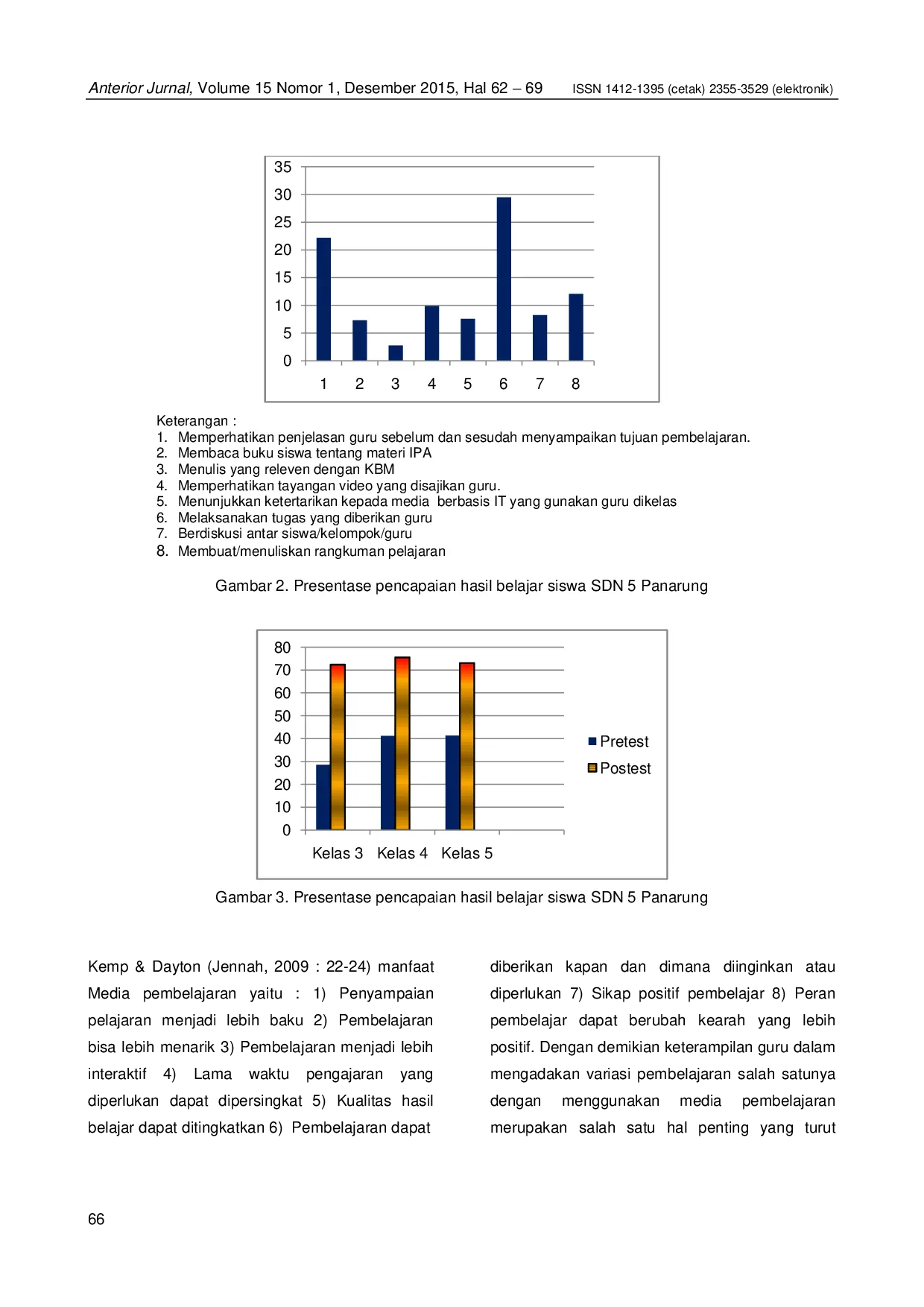 Anterior JurnalAnterior JurnalPermasalahan pembelajaran IPA yang terjadi pada siswa SDN 5 Panarung Palangka Raya adalah penggunaan media pembelajaran yang sering dilakukan guru tetapi belum dapat memberikan hasil optimal yang ditandai dengan siswa belum dapat menyimak pembelajaran dengan baik karena merasa jenuh, dan belum memiliki keberanian dalam berpendapat atau menyumbangkan ide yang berbeda menurut pandangan dan pemahaman yang ada pada diri siswa yang sebenarnya. Penelitian ini bertujuan mendeskripsikan keterampilan mahasiswa calon guru dalam menerapkan media pembelajaran berbasis IT. Untuk mengukur ketercapaian indikator penelitian tersebut dilakukan penelitian menggunakan prinsip prinsip penelitian kualitatif. Hasil penelitian menunjukkan bahwa pelaksanaan pembelajaran oleh mahasiswa calon guru SD dengan media berbasisi IT pada kategori baik dengan rata rata skor 3.05. Aktivitas siswa selama pembelajaran dengan media pembelajaran berbasis IT berkategori baik pada aktivitas melaksanakan tugas yang diberikan guru (29.5%). Pembelajaran dengan menggunakan media pembelajaran berbasis IT mampu meningkatkan hasil belajar siswa. Hal ini menunjukkan bahwa pembelajaran sudah berpusat pada siswa.