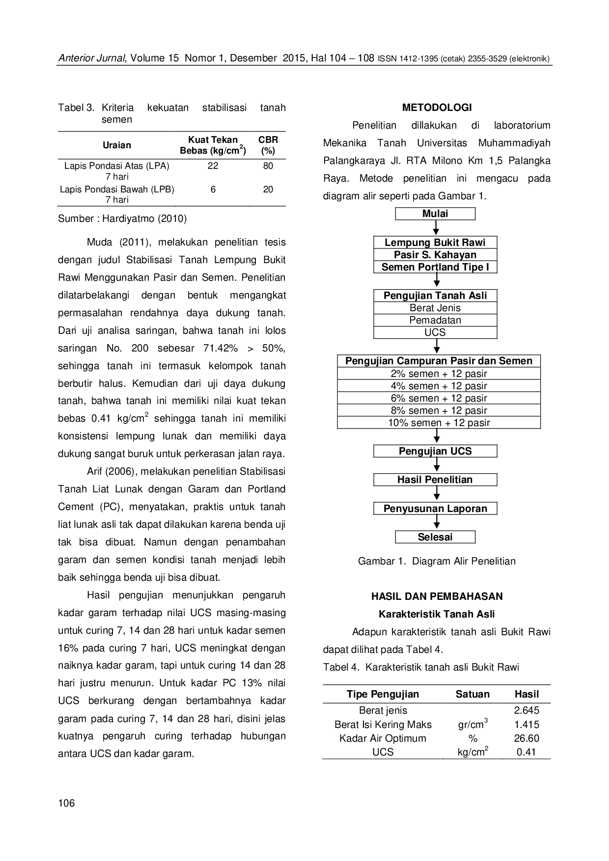 Anterior JurnalAnterior JurnalSifat tanah lempung Bukit Rawi hanya memiliki nilai UCS sebesar 0.41 kg/cm2, sehingga tidak memenuhi syarat teknis Lapis Pondasi Bawah Jalan Raya. Untuk itu, akan dilakukan perbaikan dengan penambahan pasir dan semen dan diharapkan mampu memenuhi syarat teknis perkerasan jalan raya. Tujuan dari penelitian ini adalah untuk mengetahui seberapa besar penambahan pasir dan semen pada stabilisasi tanah lempung Bukit Rawi untuk perkerasan jalan raya. Hasil penelitian menunjukkan, bahwa setelah dilakukan penambahan pasir sebesar 12% dengan semen 2%, nilai UCS naik menjadi 0.49 kg/cm2 dari kondisi awal 0.41 kg/cm2. Kemudian, penambahan semen 4%, nilai UCS juga mengalami kenaikan sebesar 4.44 kg/cm2. Pada penambahan semen sebesar 6%, nilai UCS mengalami kenaikan hingga 5.29 kg/cm2 dan penambahan semen sebesar 8%, nilai UCS naik menjadi 7.33 kg/cm2 serta penambahan semen 10%, nilai UCS mengalami kenaikan menjadi 9.06 kg/cm2. Sehingga, dengan penambahan pasir sebesar 12% dan semen optimum 8% memenuhi syarat teknis lapis pondasi bawah jalan raya karena nilai UCS hasil 7.33 kg/cm2 > 7.33 kg/cm2.