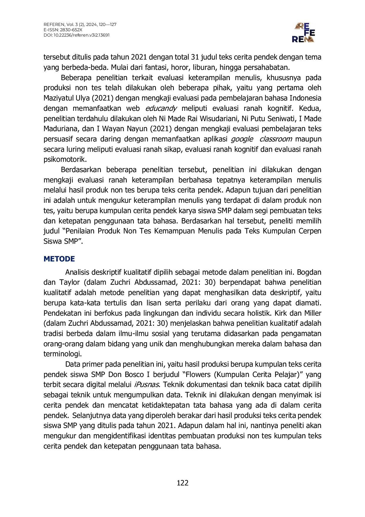 REFERENREFERENPenelitian ini bertujuan untuk mengukur keterampilan menulis yang terdapat di dalam produk non tes, yaitu berupa kumpulan cerita pendek karya siswa SMP dalam segi pembuatan teks dan ketepatan penggunaan tata bahasa. Metode yang digunakan dalam penelitian ini adalah deskriptif kualitatif. Membaca kumpulan cerita pendek dengan seksama merupakan teknik pengumpulan data yang digunakan di dalam penelitian ini. Selanjutnya data yang diperoleh berakar dari hasil produksi kumpulan teks cerita pendek siswa SMP yang ditulis pada tahun 2021. Teknik analisis yang digunakan dalam penelitian ini mencakup: 1) mengamati isi dari kumpulan cerita pendek, 2) melakukan pengelompokkan terhadap kumpulan teks cerita pendek berdasarkan tema dan minat siswa, 3) menganalisis ketepatan tata bahasa pada kumpulan cerita pendek sesuai dengan data yang terdapat di dalam pembahasan.