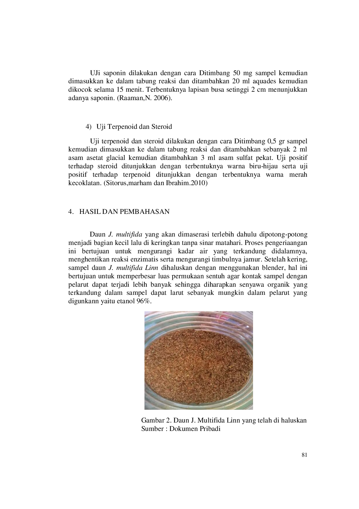 Multifida Linn menunjukkan adanya kandungan tanin, flavonoid, alkaloid, serta saponin.Berdasarkan berbagai sumber pustaka, kandungan tanin menandakan bahwa sampel tersebut memiliki potensi untuk menghambat laju korosi.Hal ini disebabkan karena tanin memiliki senyawa polifenol yang dapat menghambat reaksi oksidasi sehingga mampu menurunkan laju korosi.