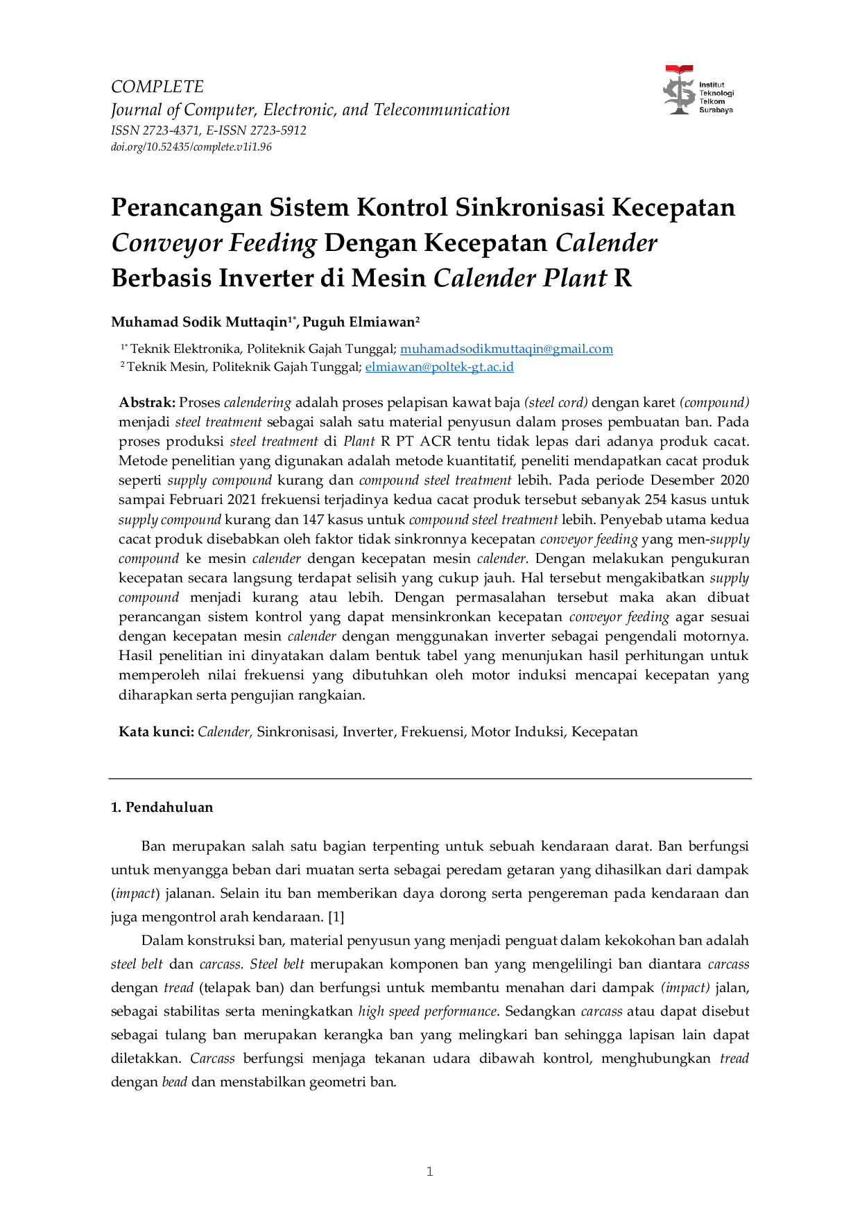 Journal of Computer, Electronic, and Telecommunication (COMPLETE)Journal of Computer, Electronic, and Telecommunication (COMPLETE)Proses calendering adalah proses pelapisan kawat baja (steel cord) dengan karet (compound) menjadi steel treatment sebagai salah satu material penyusun dalam proses pembuatan ban. Pada proses produksi steel treatment di Plant R PT ACR tentu tidak lepas dari adanya produk cacat. Metode penelitian yang digunakan adalah metode kuantitatif, peneliti mendapatkan cacat produk seperti supply compound kurang dan compound steel treatment lebih. Pada periode Desember 2020 sampai Februari 2021 frekuensi terjadinya kedua cacat produk tersebut sebanyak 254 kasus untuk supply compound kurang dan 147 kasus untuk compound steel treatment lebih. Penyebab utama kedua cacat produk disebabkan oleh faktor tidak sinkronnya kecepatan conveyor feeding yang men-supply compound ke mesin calender dengan kecepatan mesin calender. Dengan melakukan pengukuran kecepatan secara langsung terdapat selisih yang cukup jauh. Hal tersebut mengakibatkan supply compound menjadi kurang atau lebih. Dengan permasalahan tersebut maka akan dibuat perancangan sistem kontrol yang dapat mensinkronkan kecepatan conveyor feeding agar sesuai dengan kecepatan mesin calender dengan menggunakan inverter sebagai pengendali motornya. Hasil penelitian ini dinyatakan dalam bentuk tabel yang menunjukan hasil perhitungan untuk memperoleh nilai frekuensi yang dibutuhkan oleh motor induksi mencapai kecepatan yang diharapkan serta pengujian rangkaian.