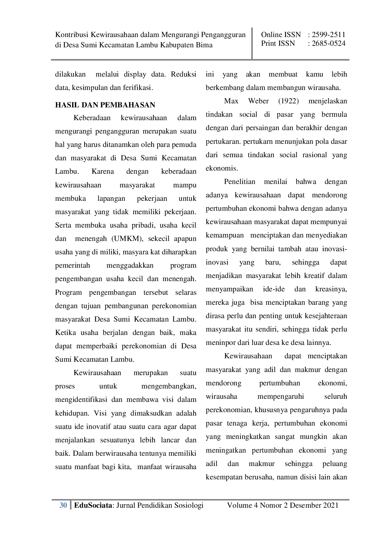 ESESKeberadaan kewirausahaan di Desa Sumi memberikan dampak positif terhadap pengurangan pengangguran. Penelitian ini menggunakan pendekatan kualitatif deskriptif dengan data primer dan sekunder, melibatkan 8 informan kunci dan 6 informan pendukung, serta teknik purposive sampling. Pengumpulan data dilakukan melalui observasi, wawancara, dan dokumentasi, kemudian dianalisis dengan reduksi data, penyajian data, dan verifikasi data. Hasil penelitian menunjukkan bahwa kewirausahaan telah mengurangi 43 pengangguran dengan penempatan di bidang pelayanan, promosi, atau pemasaran, serta memberikan pola kerja yang nyaman dan upah yang sesuai standar UMR Kota dan Kabupaten Bima. Selain itu, kewirausahaan mendorong pertumbuhan ekonomi desa, meningkatkan pendapatan masyarakat, dan mengurangi tingkat pengangguran.