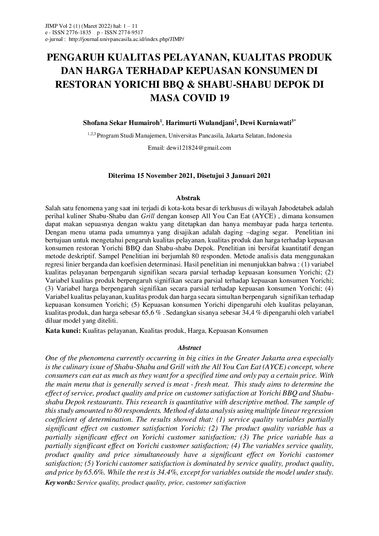 JIMP : Jurnal Ilmiah Manajemen PancasilaJIMP : Jurnal Ilmiah Manajemen PancasilaSalah satu fenomena yang saat ini terjadi di kota-kota besar di terkhusus di wilayah Jabodetabek adalah perihal kuliner Shabu-Shabu dan Grill dengan konsep All You Can Eat (AYCE), dimana konsumen dapat makan sepuasnya dengan waktu yang ditetapkan dan hanya membayar pada harga tertentu. Penelitian ini bertujuan untuk mengetahui pengaruh kualitas pelayanan, kualitas produk dan harga terhadap kepuasan konsumen restoran Yorichi BBQ dan Shabu-shabu Depok. Penelitian ini bersifat kuantitatif dengan metode deskriptif. Sampel Penelitian ini berjumlah 80 responden. Metode analisis data menggunakan regresi linier berganda dan koefisien determinasi. Hasil penelitian ini menunjukkan bahwa kualitas pelayanan, kualitas produk, dan harga secara simultan berpengaruh signifikan terhadap kepuasan konsumen Yorichi. Kepuasan konsumen Yorichi dipengaruhi oleh kualitas pelayanan, kualitas produk, dan harga sebesar 65,6%.