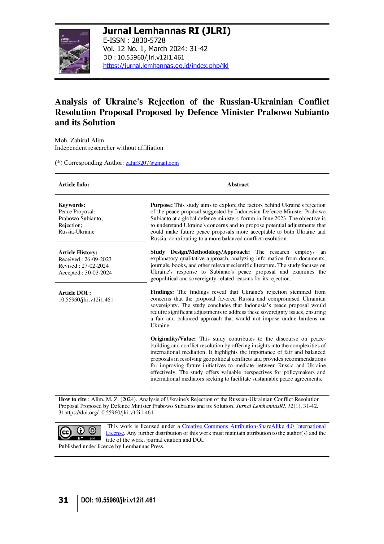 - Analysis of Ukraine's Rejection of the Russian-Ukrainian Conflict Resolution Proposal Proposed by... jurnal.lemhannas.go.id/index.php/jkl/article/view/461Analysis of Ukraines Rejection of the Russian Ukrainian Conflict Resolution Proposal Proposed by jurnal lemhannas go index php jkl article view 461