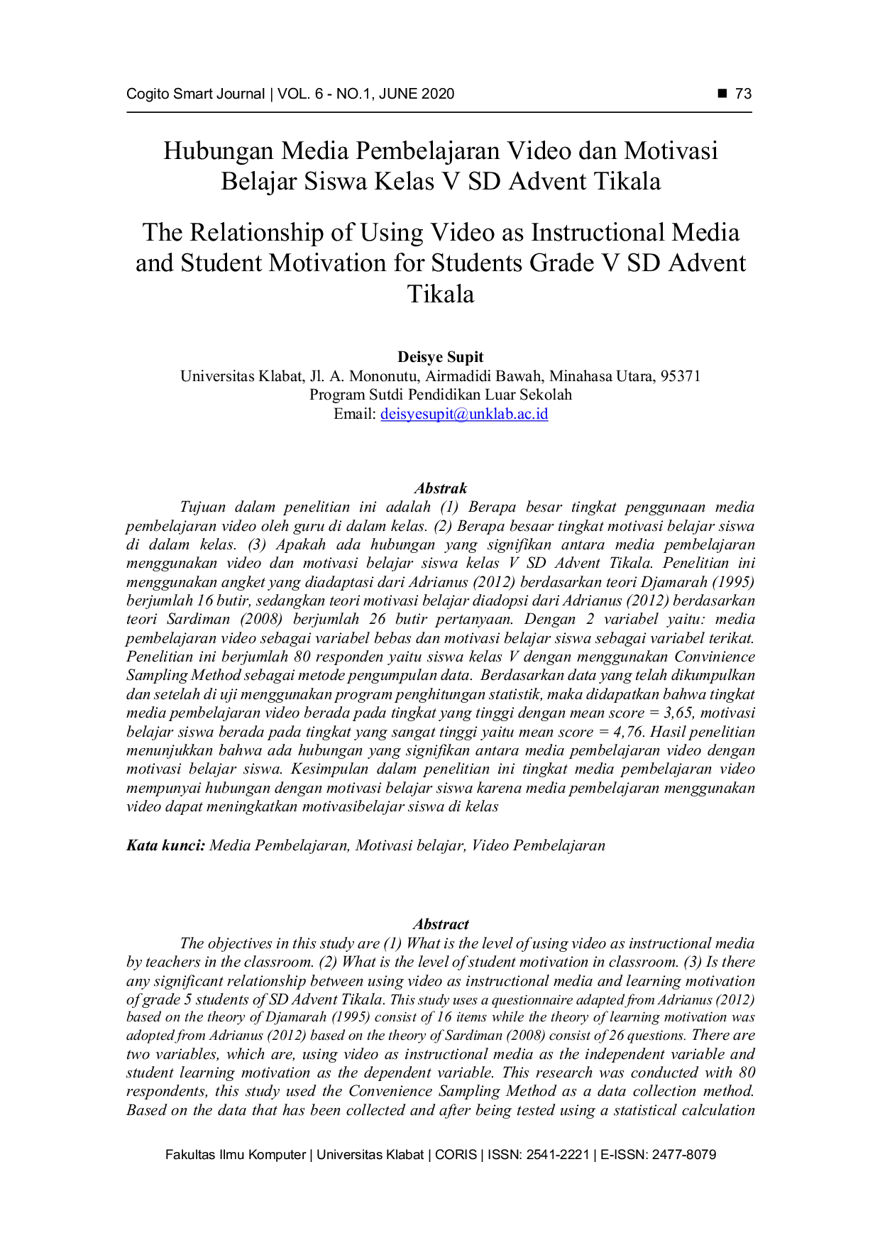 CogITo Smart JournalCogITo Smart JournalTujuan dalam penelitian ini adalah (1) Mengetahui tingkat penggunaan media pembelajaran video oleh guru di dalam kelas. (2) Mengetahui tingkat motivasi belajar siswa di dalam kelas. (3) Mengetahui apakah terdapat hubungan yang signifikan antara media pembelajaran video dan motivasi belajar siswa kelas V SD Advent Tikala. Penelitian ini menggunakan angket yang diadaptasi dari Adrianus (2012) berdasarkan teori Djamarah (1995) berjumlah 16 butir, sedangkan teori motivasi belajar diadopsi dari Adrianus (2012) berdasarkan teori Sardiman (2008) berjumlah 26 butir pertanyaan. Dengan dua variabel yaitu: media pembelajaran video sebagai variabel bebas dan motivasi belajar siswa sebagai variabel terikat. Penelitian ini melibatkan 80 responden yaitu siswa kelas V dengan menggunakan Convenience Sampling Method sebagai metode pengumpulan data. Berdasarkan data yang telah dikumpulkan dan diuji secara statistik, diperoleh bahwa tingkat penggunaan media pembelajaran video berada pada kategori tinggi dengan mean score = 3,65, sedangkan motivasi belajar siswa berada pada kategori sangat tinggi dengan mean score = 4,76. Hasil penelitian menunjukkan bahwa terdapat hubungan yang signifikan antara media pembelajaran video dengan motivasi belajar siswa.