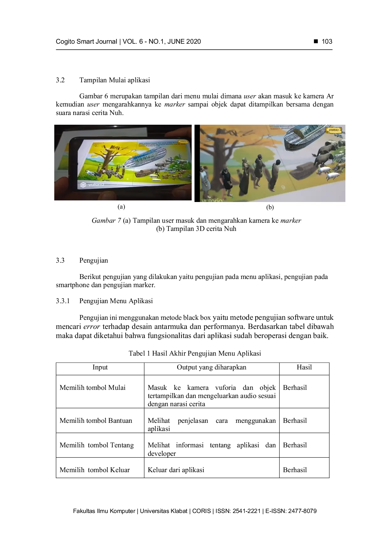 Aplikasi ini berhasil menampilkan objek animasi 3D yang interaktif dan dapat mengeluarkan suara narasi dari cerita Nuh pada setiap halaman cerita yang ada pada buku.Aplikasi ini juga dapat dijalankan pada smartphone berbasis Android.Berdasarkan hasil pengujian dapat disimpulkan bahwa jarak terbaik kamera ke marker adalah 14-25 cm untuk menampilkan 3D objek dan narasi suara dari cerita Nuh.