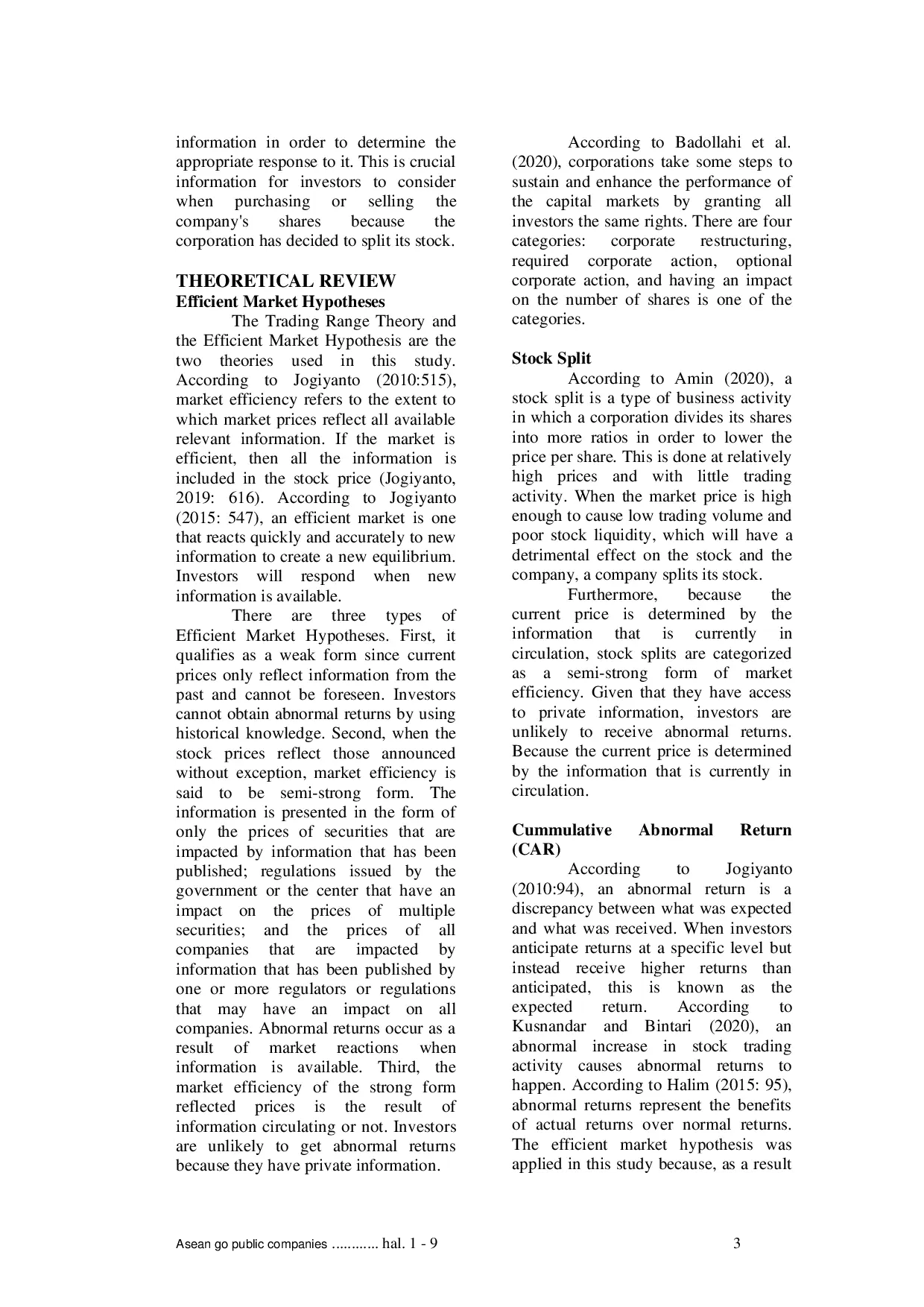 Penelitian ini menyimpulkan bahwa terdapat perbedaan yang signifikan pada cumulative abnormal returns (CAR) antara sebelum dan sesudah stock split, namun tidak terdapat perbedaan yang signifikan pada cumulative trading volume activity (CTVA) antara sebelum dan sesudah stock split.Hal ini menunjukkan bahwa pasar telah merespons informasi tentang stock split sebelum kejadian tersebut terjadi.