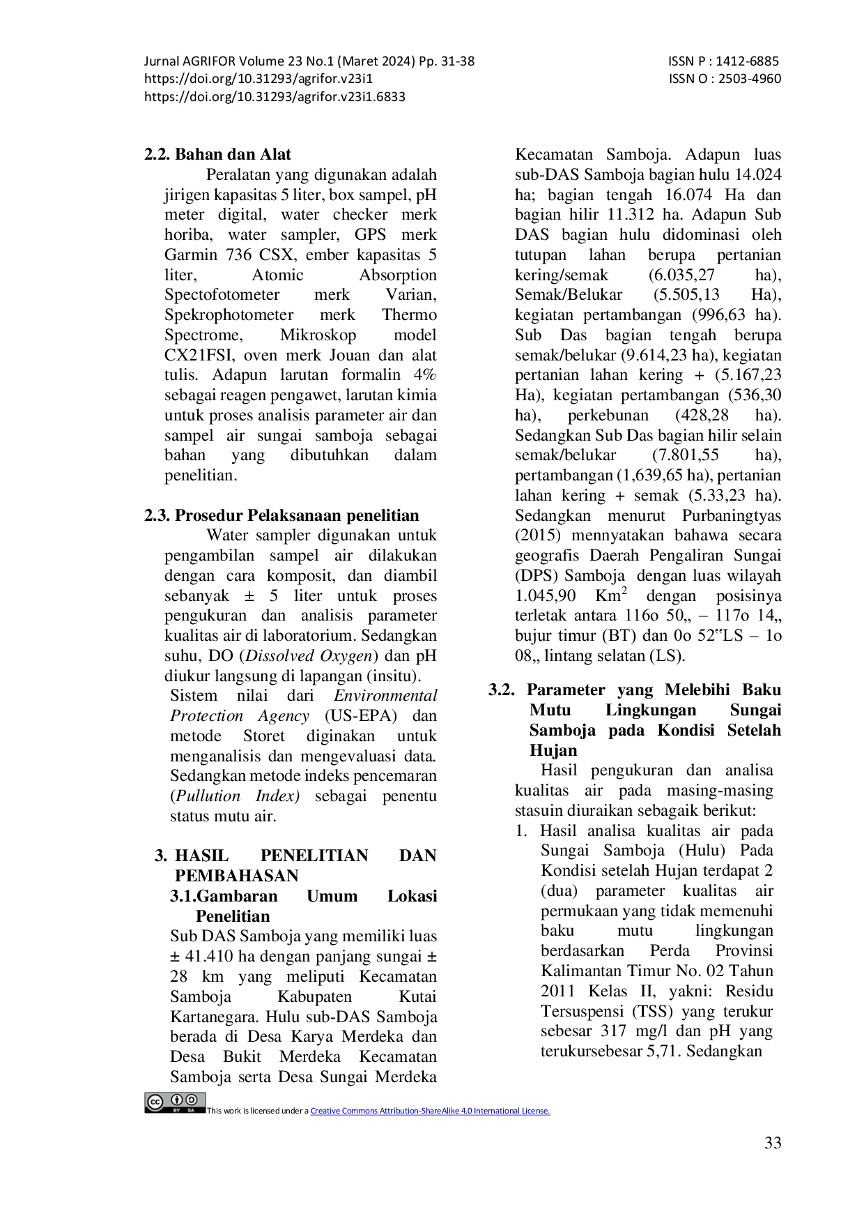Berdasarkan Peraturan Daerah Provinsi Kalimantan Timur No.02 Tahun 2011, parameter Total Suspended Solid (TSS), pH, dan DO telah melebihi baku mutu air kelas II.Evaluasi status mutu air Sungai Samboja secara spasial dan temporal menggunakan metode Storet menunjukkan bahwa alokasi air kelas II termasuk kategori cemar sedang dan cemar berat dengan skor -12 hingga -34.Sedangkan menggunakan indeks pencemaran, status mutu air Sungai Samboja secara umum tergolong dalam kategori memenuhi baku mutu hingga cemar ringan untuk mutu air kelas II dengan nilai IP 0,69 hingga 3,57.