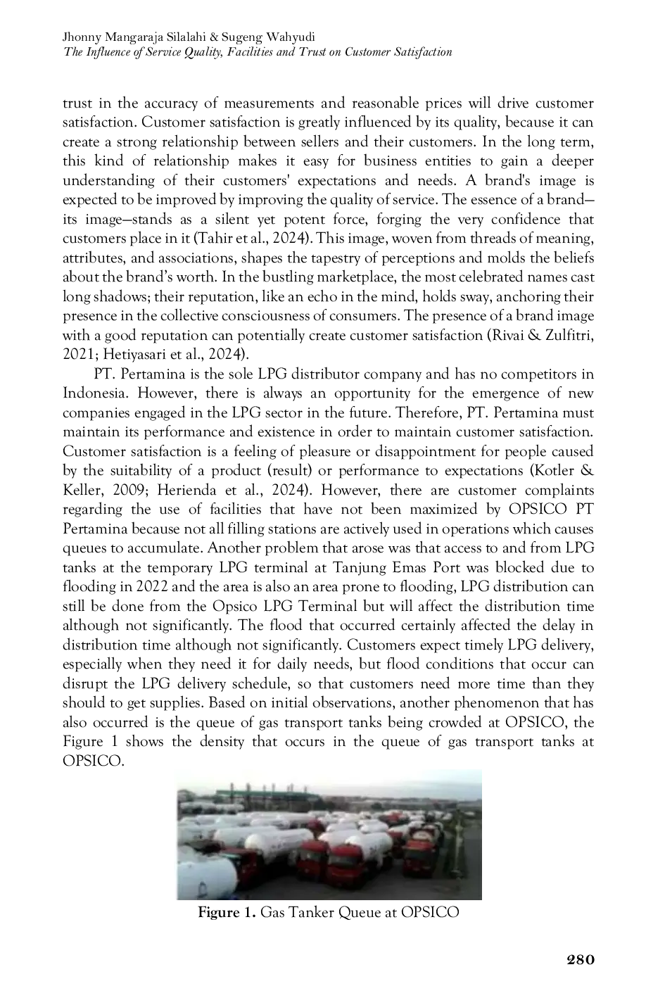 Arthatama: Journal of Business Management and AccountingArthatama: Journal of Business Management and AccountingPenelitian ini bertujuan menganalisis dampak kualitas layanan, fasilitas, dan kepercayaan terhadap kepuasan pelanggan di PT Opsico. Keperluan penelitian muncul karena antrian panjang kendaraan pengangkutan gas, penundaan distribusi LPG akibat keterbatasan infrastruktur, serta penggunaan fasilitas yang kurang optimal. Kondisi ini menunjukkan kesenjangan antara ekspektasi pelanggan dan kualitas layanan Opsico. Penelitian ini mengimplikasi pentingnya pengelolaan rantai pasok LPG secara efisien dan berkelanjutan untuk mengatasi tantangan layanan energi publik yang andal dan ramah lingkungan. Metode penelitian menggunakan pendekatan kuantitatif melalui survei dengan kuesioner. Total responden sebanyak 85 SPBE/SPPBE. Analisis menggunakan Structural Equation Modeling-Partial Least Squares menunjukkan bahwa kualitas layanan, fasilitas, dan kepercayaan saling terkait dalam membentuk kepuasan pelanggan. Kualitas layanan yang tinggi, fasilitas yang memadai, dan kepercayaan yang kuat secara signifikan meningkatkan kepuasan pelanggan.