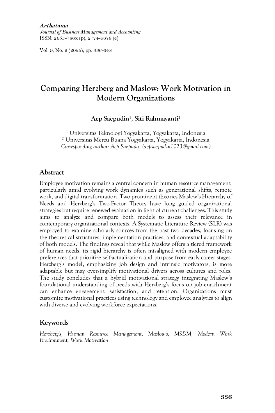 Arthatama: Journal of Business Management and AccountingArthatama: Journal of Business Management and AccountingMotivasi karyawan tetap menjadi perhatian utama dalam manajemen sumber daya manusia, terutama di tengah dinamika kerja yang terus berkembang seperti pergantian generasi, kerja jarak jauh, dan transformasi digital. Dua teori utama, Teori Hierarki Kebutuhan Maslow dan Teori Dua Faktor Herzberg, telah lama membimbing strategi organisasi namun perlu dievaluasi kembali menghadapi tantangan saat ini. Penelitian ini bertujuan menganalisis dan membandingkan kedua model untuk menilai relevansinya dalam konteks organisasi kontemporer. Metode yang digunakan adalah Studi Tinjauan Literatur Sistematis (SLR) untuk mengevaluasi sumber akademik dari dua dekade terakhir, dengan fokus pada struktur teoritis, praktik penerapan, serta adaptabilitas kontekstual kedua model. Temuan menunjukkan bahwa meskipun Maslow menawarkan kerangka kerja hirarkis kebutuhan manusia, struktur yang kaku kurang selaras dengan preferensi karyawan modern yang mengutamakan aktualisasi diri dan makna kerja sejak awal karier. Model Herzberg, yang menekankan desain pekerjaan dan motivator intrinsik, lebih adaptif namun dapat menyederhanakan faktor motivasi lintas budaya dan peran. Penelitian menyimpulkan bahwa strategi motivasi hibrida yang menggabungkan pemahaman dasar Maslow tentang kebutuhan dengan fokus Herzberg pada pengayaan pekerjaan dapat meningkatkan keterlibatan, kepuasan, dan retensi karyawan. Organisasi harus menyesuaikan praktik motivasi menggunakan teknologi dan analitik karyawan agar selaras dengan harapan tenaga kerja yang beragam dan dinamis.