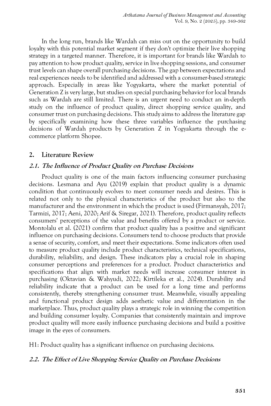 Arthatama: Journal of Business Management and AccountingArthatama: Journal of Business Management and AccountingPenelitian ini bertujuan untuk menganalisis pengaruh kualitas produk, kualitas layanan live shopping, dan kepercayaan konsumen terhadap keputusan pembelian produk Wardah oleh Generasi Z melalui platform e-commerce Shopee di Yogyakarta. Dalam konteks digital, kepercayaan konsumen, selain kualitas produk, merupakan faktor kunci dalam menentukan perilaku pembelian online. Penelitian ini menggunakan pendekatan kuantitatif dengan 100 responden yang dipilih melalui teknik purposive sampling. Instrumen penelitian adalah kuesioner tertutup dengan skala Likert lima poin, dan data dianalisis menggunakan regresi linear berganda. Hasil penelitian menunjukkan bahwa kualitas produk dan kepercayaan konsumen memiliki pengaruh parsial yang signifikan terhadap keputusan pembelian, sementara kualitas layanan live shopping tidak memiliki pengaruh signifikan. Namun, secara simultan, ketiga variabel memiliki pengaruh yang signifikan dengan nilai Adjusted R² sebesar 0,603, yang berarti 60,3% variasi dalam keputusan pembelian dapat dijelaskan oleh model ini. Temuan ini menekankan pentingnya pendekatan holistik dalam strategi pemasaran digital, yang menekankan kualitas produk, membangun kepercayaan, dan meningkatkan efektivitas layanan live shopping untuk mendorong loyalitas konsumen di era e-commerce.