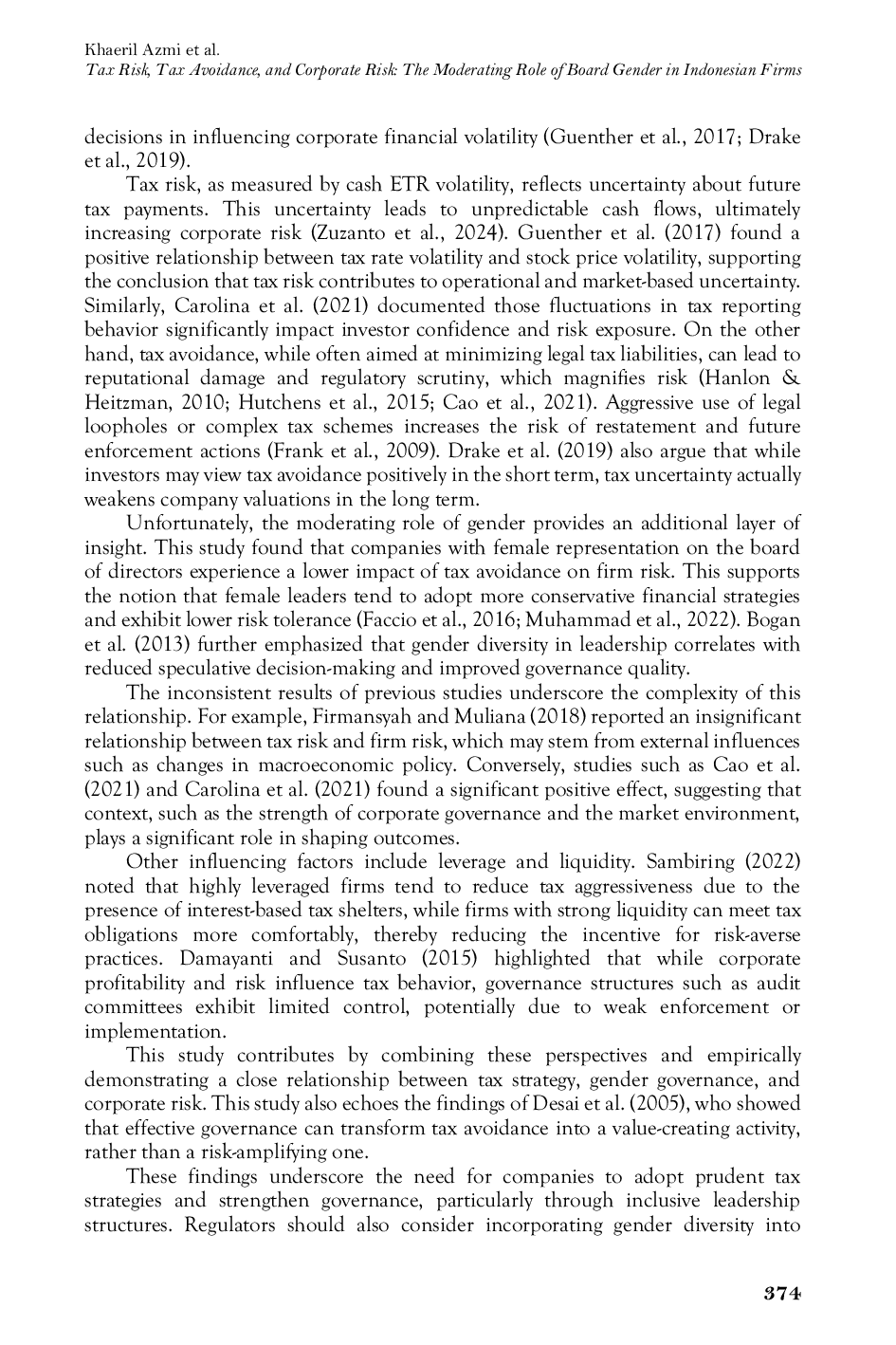 Penelitian ini menemukan bahwa risiko pajak berpengaruh negatif signifikan terhadap risiko perusahaan, menunjukkan bahwa perusahaan cenderung mengadopsi kebijakan yang lebih hati-hati ketika menghadapi ketidakpastian fiskal.Sebaliknya, penghindaran pajak berdampak positif signifikan terhadap risiko perusahaan, terkait dengan volatilitas arus kas dan risiko reputasi yang lebih tinggi.Representasi gender perempuan di dewan direksi tidak secara signifikan memoderasi hubungan antara penghindaran pajak dan risiko perusahaan, kemungkinan besar karena proporsi perempuan yang masih terbatas.