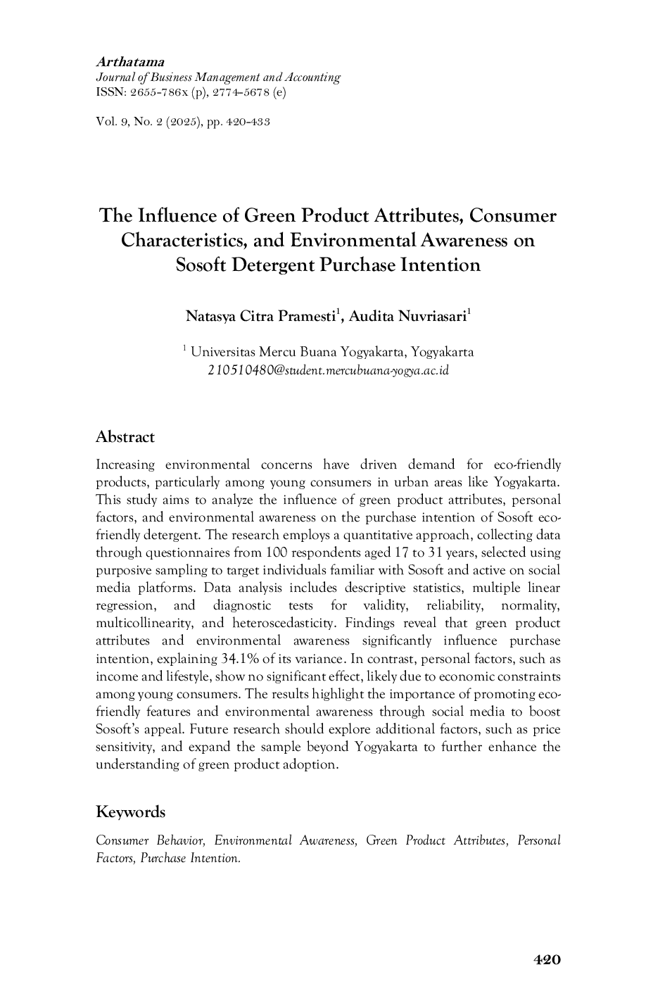 Arthatama: Journal of Business Management and AccountingArthatama: Journal of Business Management and AccountingKenaikan kekhawatiran lingkungan mendorong permintaan produk ramah lingkungan, terutama di kalangan konsumen muda di kawasan Yogyakarta. Penelitian ini bertujuan menganalisis pengaruh atribut produk hijau, faktor pribadi, dan kesadaran lingkungan terhadap niat beli deterjen eco-friendly Sosoft. Penelitian menggunakan pendekatan kuantitatif dengan kuesioner terhadap 100 responden usia 17–31 tahun. Hasil menunjukkan atribut produk hijau dan kesadaran lingkungan berpengaruh signifikan terhadap niat beli (34,1% varian), sementara faktor pribadi seperti penghasilan tidak signifikan. Penelitian menyarankan penguatan promosi atribut hijau melalui media sosial serta eksplorasi faktor lain seperti sensitivitas harga.