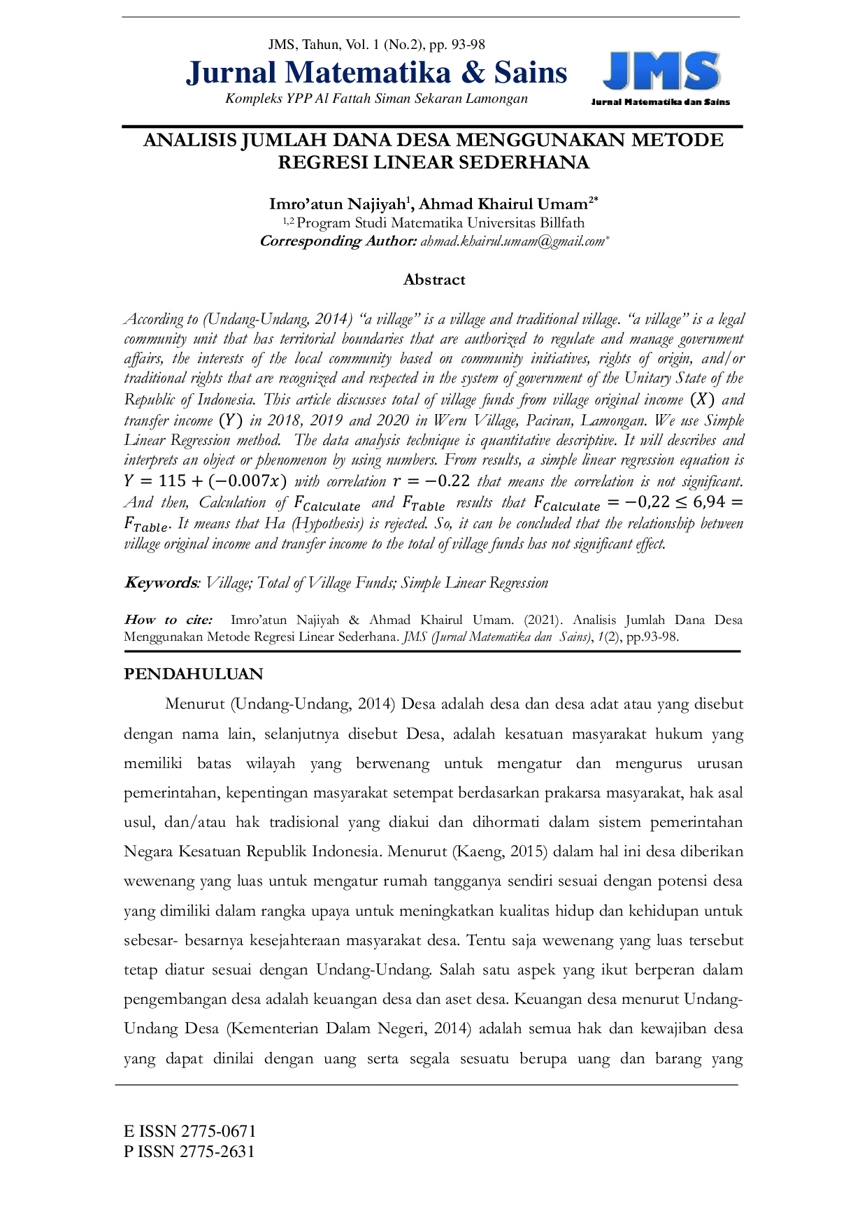 Jurnal Matematika dan Sains (JMS)Jurnal Matematika dan Sains (JMS)Menurut (Undang-Undang, 2014) βdesa adalah desa dan desa adat. βDesa adalah satuan masyarakat hukum yang memiliki batas wilayah yang berwenang untuk mengatur dan mengelola urusan pemerintahan, kepentingan masyarakat setempat berdasarkan prakarsa masyarakat, hak asal usul, dan/atau hak tradisional yang diakui dan dihormati dalam sistem pemerintahan Negara Kesatuan Republik Indonesia. Artikel ini membahas total dana desa dari pendapatan asli desa (π) dan pendapatan transfer (π) pada tahun 2018, 2019 dan 2020 di Desa Weru, Paciran, Lamongan. Kami menggunakan metode Regresi Linear Sederhana. Teknik analisis data bersifat deskriptif kuantitatif. Ini akan menggambarkan dan menafsirkan suatu objek atau fenomena dengan menggunakan angka. Dari hasil penelitian, diperoleh persamaan regresi linear sederhana yaitu π = 115 (β0.007π₯) dengan korelasi π = β0.22 yang berarti korelasinya tidak signifikan. Dan kemudian, Perhitungan πΉπΆππππ’πππ‘π dan πΉπππππ menghasilkan πΉπΆππππ’πππ‘π = β0,22 β€ 6,94 = πΉπππππ. Ini berarti bahwa Ha (Hipotesis) ditolak. Jadi, dapat disimpulkan bahwa hubungan antara pendapatan asli desa dan pendapatan transfer terhadap total dana desa tidak berpengaruh signifikan.
