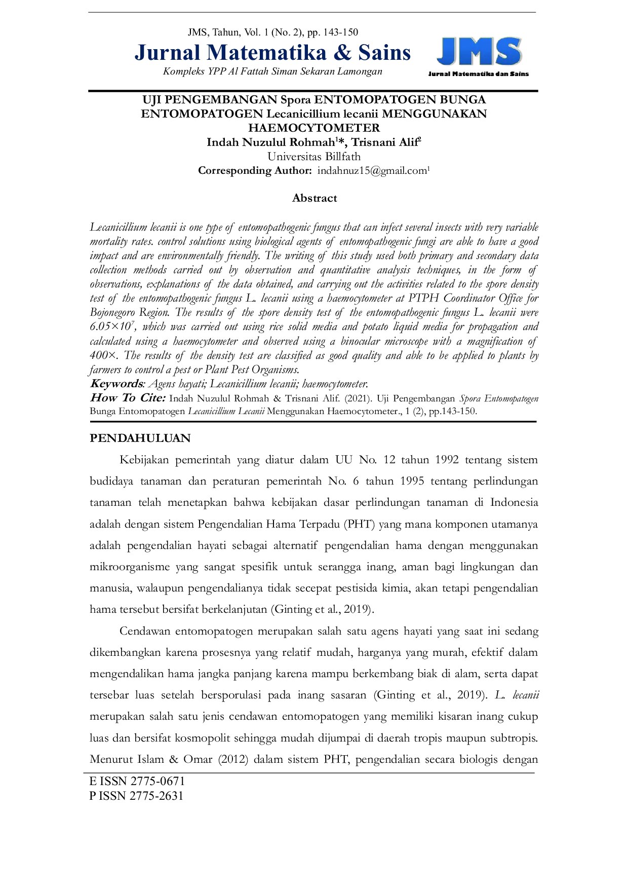 Jurnal Matematika dan Sains (JMS)Jurnal Matematika dan Sains (JMS)Lecanicillium lecanii adalah salah satu jenis cendawan entomopatogen yang dapat menginfeksi berbagai serangga dengan tingkat mortalitas yang sangat bervariasi. Solusi pengendalian menggunakan agen hayati dari cendawan entomopatogen dapat memberikan dampak yang baik dan ramah lingkungan. Tulisan penelitian ini menggunakan metode pengumpulan data primer dan sekunder yang dilakukan melalui observasi dan teknik analisis kuantitatif, berupa observasi, penjelasan data yang diperoleh, dan pelaksanaan kegiatan terkait uji kerapatan spora cendawan entomopatogen L. lecanii menggunakan haemocytometer di Kantor Koordinator PTPH Wilayah Bojonegoro. Hasil uji kerapatan spora cendawan L. lecanii menunjukkan nilai 6.05×107, yang dilakukan dengan menggunakan media padat beras dan media cair kentang untuk perbanyakan, dihitung menggunakan haemocytometer, dan diamati menggunakan mikroskop binokuler dengan perbesaran 400×. Hasil uji kerapatan spora ini diklasifikasikan sebagai kualitas baik dan dapat diterapkan oleh petani untuk mengendalikan hama atau OPT (Organisme Pengganggu Tanaman).