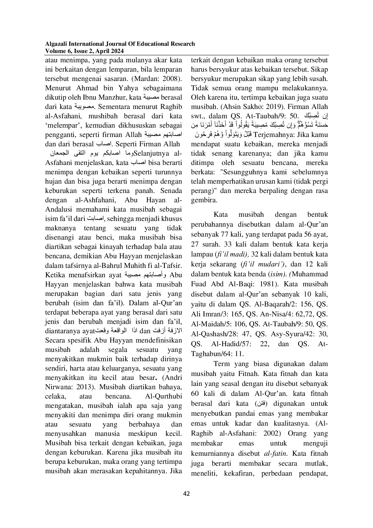 AIJER: Algazali International Journal Of Educational ResearchAIJER: Algazali International Journal Of Educational ResearchPenelitian ini menelusuri makna Musibah dalam Al-Quran dan Hadis-hadisnya sehingga memberikan pemahaman dalam pembelajaran. Menguraikan makna, wujud, dan urgensi musibah dalam al-Quran dan hadis-hadis tentang musibah. Jenis penelitian yang digunakan adalah kualitatif dengan menggunakan metode library research. Penelitian ini berkesimpulan bahwa tidak semua musibah itu berkonotasi negatif karena bisa saja musibah berkaitan dengan kebaikan. Adapun wujud dari musibah telah tergambar dalam ayat-ayat al-Quran, seperti musibah terjadi karena ulah manusia antara lain karena dosanya terdapat dalam QS. Asy-Syura/42:30. Dan masih banyak ayat al-Quran yang berbicara mengenai musibah. Dengan memahami makna musibah dapat membantu dalam proses pembelajaran al-Quran dan Hadis.
