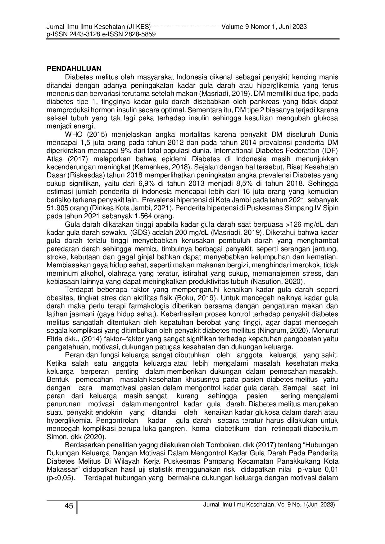 OjsGapuOjsGapuLatar Belakang :Diabetes Melitus merupakan penyakit yang kronis yang ditandai dengan adanya peningakatan kadar gula darah atau hiperglikemia. Kadar gula darah terlalu tinggi menyebabkan kerusakan pembuluh darah yang menghambat peredaran darah sehingga memicu timbulnya berbagai penyakit, seperti serangan jantung, stroke, kebutaan dan gagal ginjal bahkan dapat menyebabkan kelumpuhan dan kematian. Dukungan keluarga dan motivasi sangatlah diperlukan dalam keberhasilan diet diabetes melitus terutama dalam proses kontrol terhadap penyakit diabetes melitus. Tujuan : Penelitian ini adalah untuk megetahui hubungan dukungan keluarga degan motivasi dalam menontrol kadar gula darah pasien diabetes melitus tipe 2. Metode : Penelitian ini merupakan survei analitik dengan pendekatan Cross sectional. Populasi dalam penelitian ini adalah seluruh pasien diabetes melitus tipe 2 di Wilayah Kerja Puskesmas Simpang IV Sipin Kota Jambi sebanyak 1.564 responden dengan sampel sebanyak 60 responden dengan tehnik purposive sampling. Hasil : Penelitian didapatkan bahwa terdapat hubungan yang signifikan antara dukungan keluarga dengan motivasi menjalankan diet diabetes mellitus dalam mengontrol gula darah pasien diabetes melitus tipe 2 dengan p value 0.000 (p<0,05). Kesimpulan : Dukungan keluarga sangat diperlukan oleh para penderita penyakit kronis khususnya diabetes melitus, diharapan keluargayang memiliki anggota keluarga dengan diabetes melitus, lebih terlibat dalam merawat pasien dengan diabetes melitus, keterlibatan dari anggota keluarga tidak hanya secara fisik atau material tetapi juga secara psikologis yaitu berupa pemberian perhatian dan dukungan.