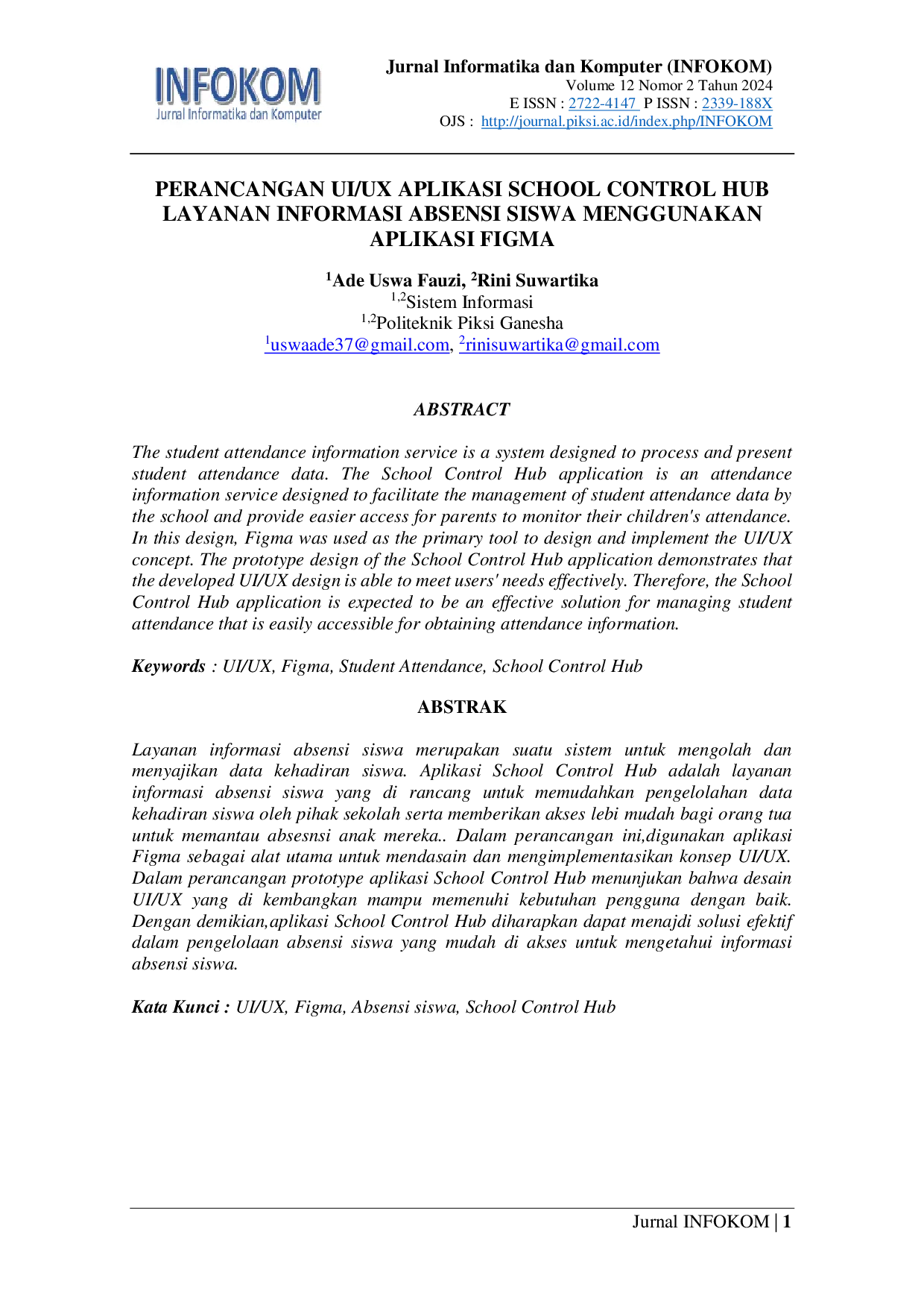 INFOKOM (Informatika & Komputer)INFOKOM (Informatika & Komputer)Layanan informasi absensi siswa merupakan suatu sistem untuk mengolah dan menyajikan data kehadiran siswa. Aplikasi School Control Hub adalah layanan informasi absensi siswa yang dirancang untuk memudahkan pengelolaan data kehadiran siswa oleh pihak sekolah serta memberikan akses lebih mudah bagi orang tua untuk memantau absensi anak mereka. Dalam perancangan ini, digunakan aplikasi Figma sebagai alat utama untuk mendesain dan mengimplementasikan konsep UI/UX. Dalam perancangan prototype aplikasi School Control Hub menunjukkan bahwa desain UI/UX yang dikembangkan mampu memenuhi kebutuhan pengguna dengan baik. Dengan demikian, aplikasi School Control Hub diharapkan dapat menjadi solusi efektif dalam pengelolaan absensi siswa yang mudah diakses untuk mengetahui informasi absensi siswa.