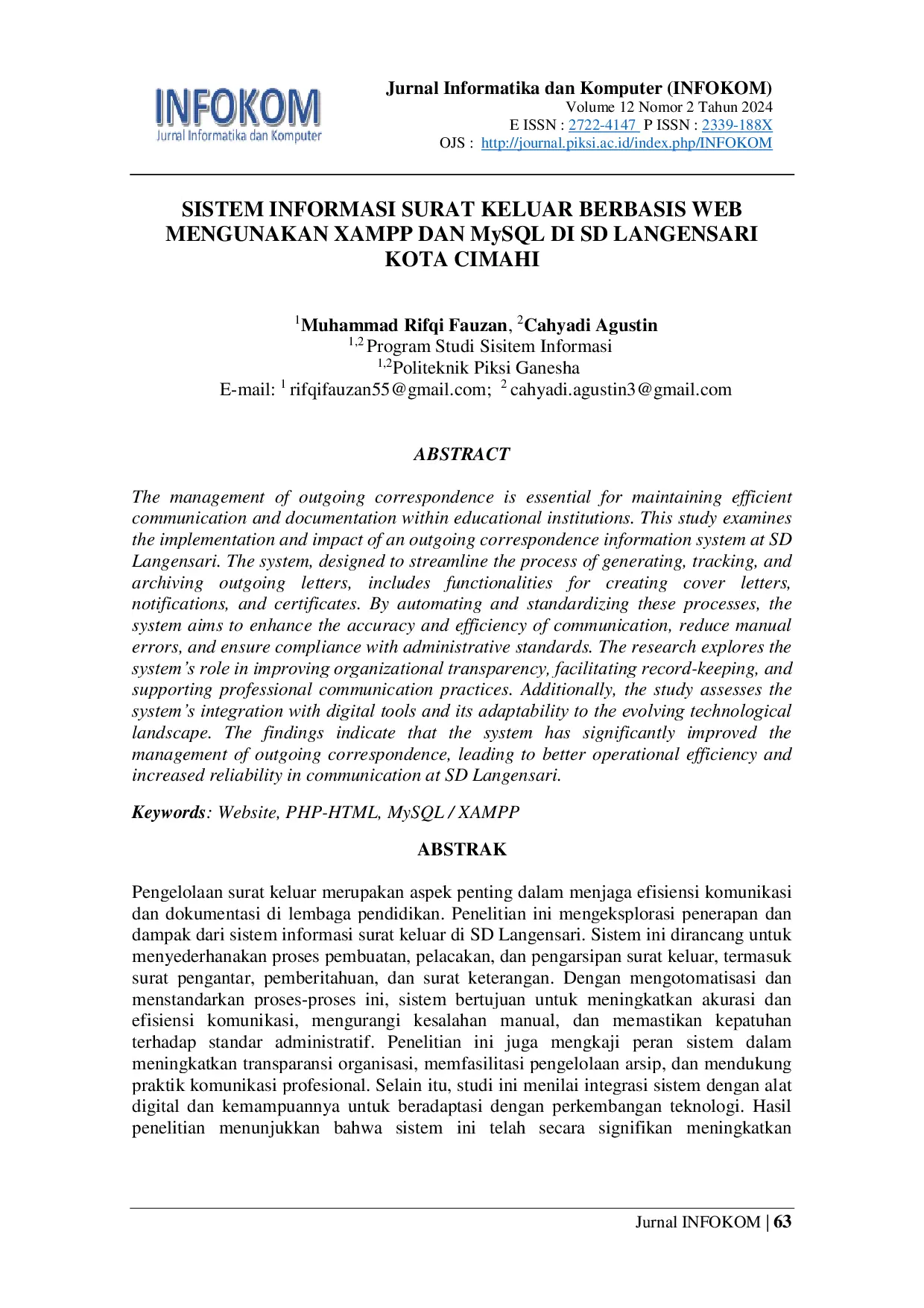 INFOKOM (Informatika & Komputer)INFOKOM (Informatika & Komputer)Pengelolaan surat keluar merupakan aspek penting dalam menjaga efisiensi komunikasi dan dokumentasi di lembaga pendidikan. Penelitian ini mengeksplorasi penerapan dan dampak dari sistem informasi surat keluar di SD Langensari. Sistem ini dirancang untuk menyederhanakan proses pembuatan, pelacakan, dan pengarsipan surat keluar, termasuk surat pengantar, pemberitahuan, dan surat keterangan. Dengan mengotomatisasi dan menstandarkan proses-proses ini, sistem bertujuan untuk meningkatkan akurasi dan efisiensi komunikasi, mengurangi kesalahan manual, dan memastikan kepatuhan terhadap standar administratif. Penelitian ini juga mengkaji peran sistem dalam meningkatkan transparansi organisasi, memfasilitasi pengelolaan arsip, dan mendukung praktik komunikasi profesional. Selain itu, studi ini menilai integrasi sistem dengan alat digital dan kemampuannya untuk beradaptasi dengan perkembangan teknologi. Hasil penelitian menunjukkan bahwa sistem ini telah secara signifikan meningkatkan pengelolaan surat keluar, yang mengarah pada efisiensi operasional yang lebih baik dan keandalan komunikasi yang meningkat di SD Langensari.