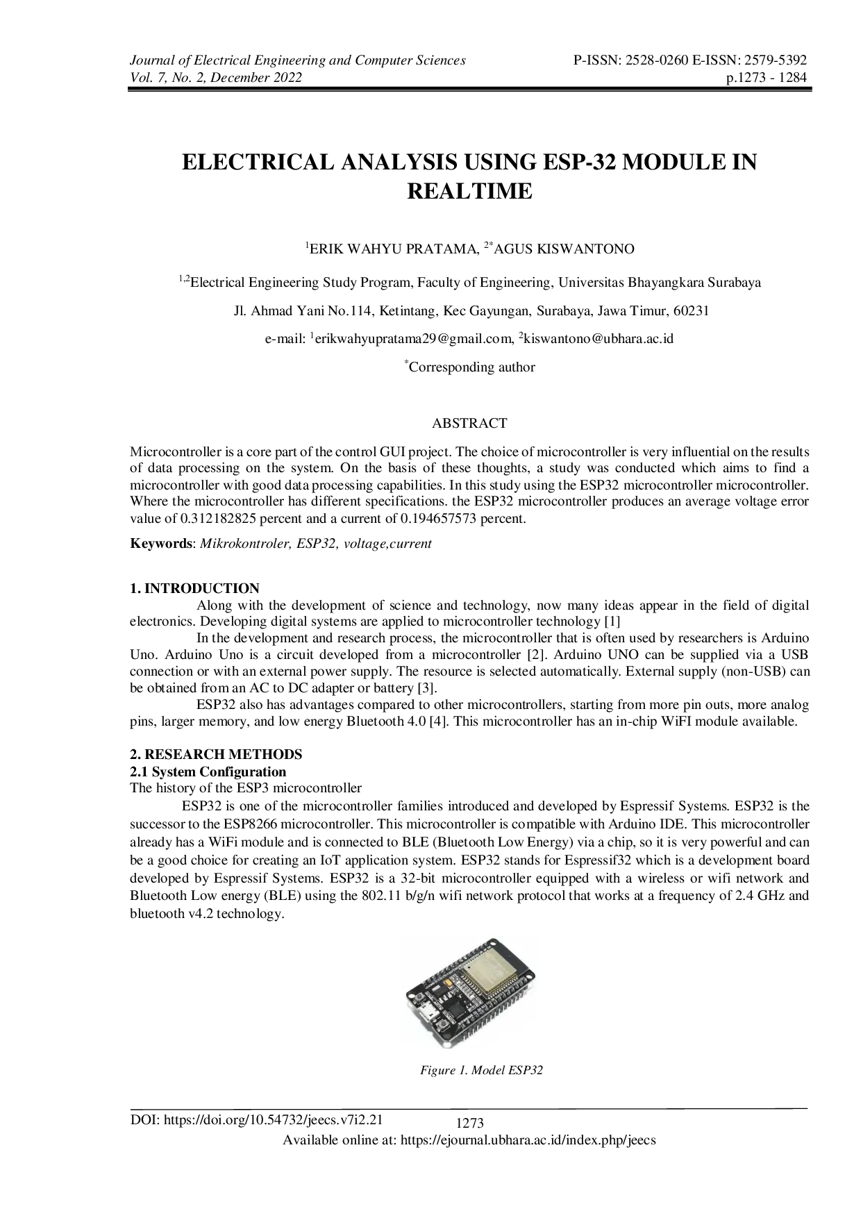 JEECS (Journal of Electrical Engineering and Computer Sciences)JEECS (Journal of Electrical Engineering and Computer Sciences)Mikrokontroler merupakan bagian inti dari proyek GUI kontrol. Pemilihan mikrokontroler sangat mempengaruhi hasil pemrosesan data pada sistem. Berdasarkan hal ini, dilakukan studi untuk menemukan mikrokontroler dengan kemampuan pemrosesan data yang baik. Dalam studi ini menggunakan mikrokontroler ESP32. Mikrokontroler ini memiliki spesifikasi yang berbeda. Mikrokontroler ESP32 menghasilkan nilai rata-rata kesalahan tegangan sebesar 0,312182825 persen dan arus sebesar 0,194657573 persen.