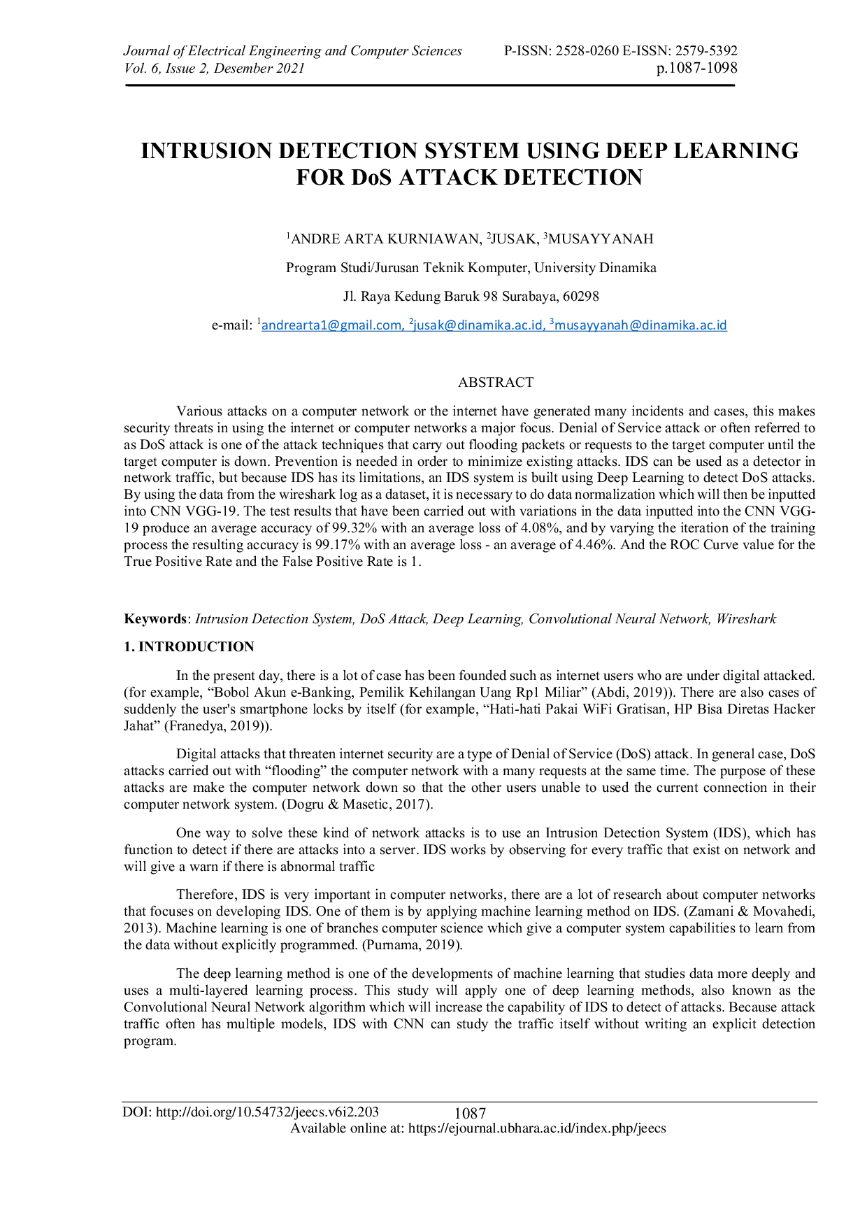 JEECS (Journal of Electrical Engineering and Computer Sciences)JEECS (Journal of Electrical Engineering and Computer Sciences)Berbagai serangan pada jaringan komputer atau internet telah menghasilkan banyak kejadian dan kasus, hal ini membuat ancaman keamanan dalam penggunaan internet atau jaringan komputer menjadi fokus utama. Serangan Denial of Service (DoS) merupakan salah satu teknik serangan yang melaksanakan flooding paket atau permintaan ke komputer target hingga komputer target tidak beroperasi. Diperlukan pencegahan untuk meminimalkan serangan yang ada. IDS dapat digunakan sebagai detector dalam lalu lintas jaringan, namun karena keterbatasan IDS, sistem IDS dibangun menggunakan Deep Learning untuk mendeteksi serangan DoS. Dengan menggunakan data dari log wireshark sebagai dataset, diperlukan normalisasi data yang akan dimasukkan ke CNN VGG-19. Hasil uji yang telah dilakukan dengan variasi data yang dimasukkan ke CNN VGG-19 menghasilkan tingkat akurasi rata-rata sebesar 99,32% dengan tingkat kerugian rata-rata 4,08%, dan dengan variasi iterasi proses pelatihan tingkat akurasi yang dihasilkan 99,17% dengan tingkat kerugian rata-rata 4,46%. Nilai kurva ROC untuk Tingkat Positif Benar dan Tingkat Positif Palsu adalah 1.