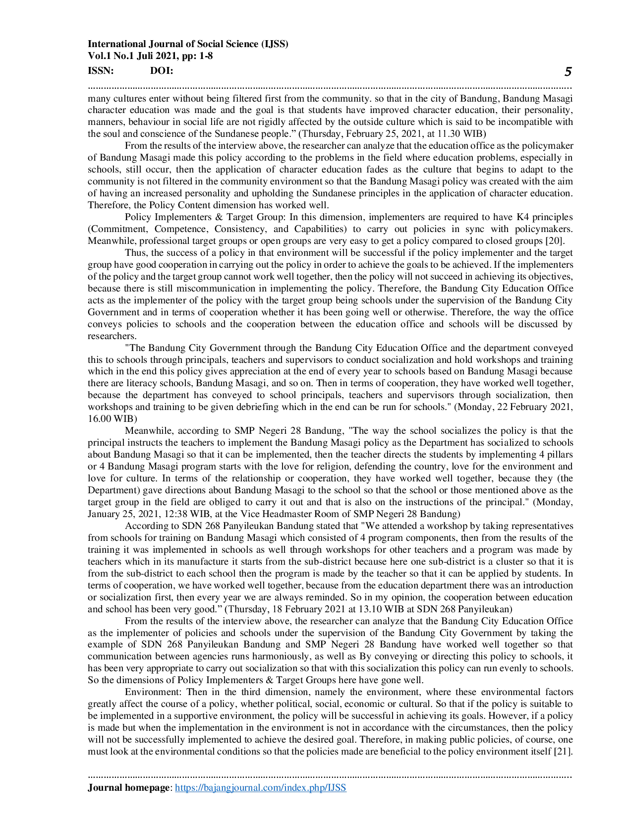 International Journal of Social ScienceInternational Journal of Social ScienceImplementasi kebijakan ini dipicu oleh masalah yang masih terjadi dalam lingkungan pendidikan, khususnya perundungan di lingkungan sekolah yang sering dialami siswa baru. Oleh karena itu, kebijakan pendidikan karakter berbasis kearifan lokal budaya Sunda, bernama Bandung Masagi, dibuat dengan tujuan menumbuhkan karakter sempurna siswa. Penelitian ini bertujuan mengidentifikasi dan mendeskripsikan pelaksanaan kebijakan Bandung Masagi menggunakan metode deskriptif kualitatif dengan teknik pengumpulan data observasi, wawancara, dan studi literatur.