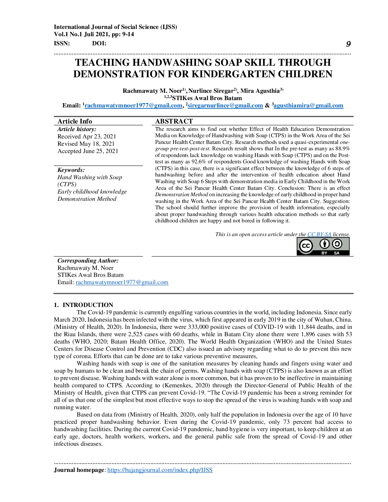 International Journal of Social ScienceInternational Journal of Social SciencePenelitian ini bertujuan untuk mengetahui pengaruh media demonstrasi pendidikan kesehatan terhadap pengetahuan mencuci tangan dengan sabun (CTPS) di wilayah kerja Puskesmas Sei Pancur, Kota Batam. Metode yang digunakan adalah quasi-eksperimental dengan desain satu kelompok pre-test‑post-test. Hasil penelitian menunjukkan bahwa pada pre-test sebanyak 88,9 % responden kurang memiliki pengetahuan tentang mencuci tangan dengan sabun (CTPS), sedangkan pada post-test sebanyak 92,6 % responden memiliki pengetahuan yang baik. Terdapat pengaruh signifikan antara pengetahuan enam langkah mencuci tangan sebelum dan sesudah intervensi pendidikan kesehatan mengenai Hand Washing with Soap 6 Steps dengan media demonstrasi pada anak usia dini di wilayah kerja Puskesmas Sei Pancur, Kota Batam. Kesimpulannya, metode demonstrasi berpengaruh positif dalam meningkatkan pengetahuan anak usia dini tentang cara mencuci tangan yang tepat di wilayah kerja Puskesmas Sei Pancur, Kota Batam. Saran: sekolah sebaiknya meningkatkan penyediaan informasi kesehatan, khususnya tentang cara mencuci tangan yang benar, melalui berbagai metode pendidikan kesehatan agar anak usia dini dapat mengikuti dengan menyenangkan dan tidak merasa bosan.