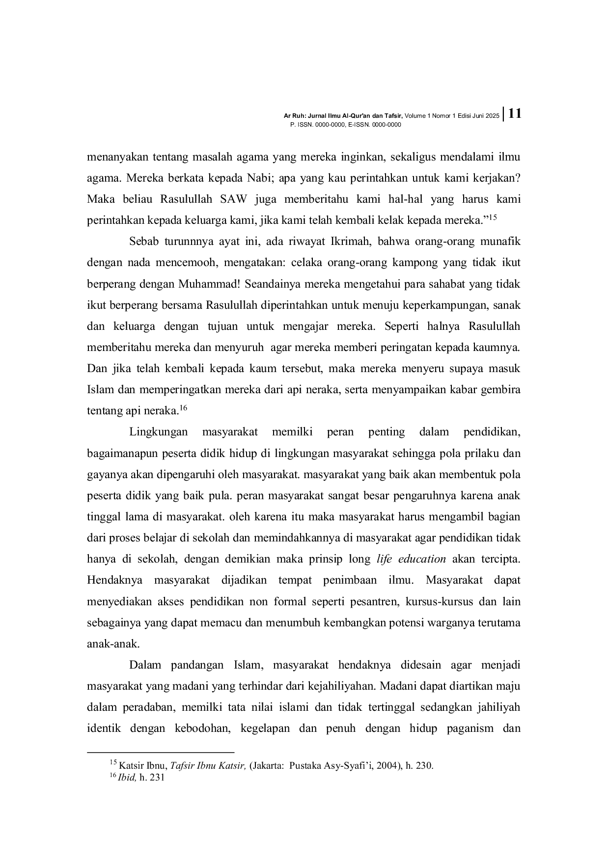 Ar Ruh: Jurnal Ilmu Al-Qur'an dan TafsirAr Ruh: Jurnal Ilmu Al-Qur'an dan TafsirPenelitian ini bertujuan untuk mengetahui konsep Al-Quran tentang sistem pendidikan di keluarga, sekolah, dan masyarakat. Metode penelitian ini menekankan pada studi kepustakaan yang diperoleh dari buku-buku terkait definisi dan sistem pendidikan, tuntutan dan kewajiban mencari ilmu, ayat-ayat dan hadis berkaitan dengan pendidikan, serta definisi pendidikan dalam keluarga, sekolah, dan masyarakat. Pengumpulan data dilakukan melalui sumber buku, jurnal, artikel, majalah, dan internet yang relevan. Analisis data menggunakan teknik analisis Miles dan Huberman dengan tahapan reduksi data, penyajian data, dan penarikan kesimpulan. Hasil penelitian menunjukkan bahwa keluarga merupakan fondasi pembentukan karakter manusia, khususnya peran orang tua sebagaimana hadis Nabi Muhammad saw yang diriwayatkan oleh Bukhari dan Muslim. Lingkungan sekolah dan masyarakat juga berpengaruh pada perkembangan individu, mendorong kehadiran terus-menerus dalam majelis ilmu. Masyarakat memiliki peran penting dalam pendidikan, karena peserta didik hidup di dalamnya dan dipengaruhi oleh pola perilaku dan gaya hidup masyarakat. Masyarakat yang baik akan membentuk peserta didik yang baik pula, karena anak-anak menghabiskan waktu lama di masyarakat sebagai bagian dari pendidikan sepanjang hayat.
