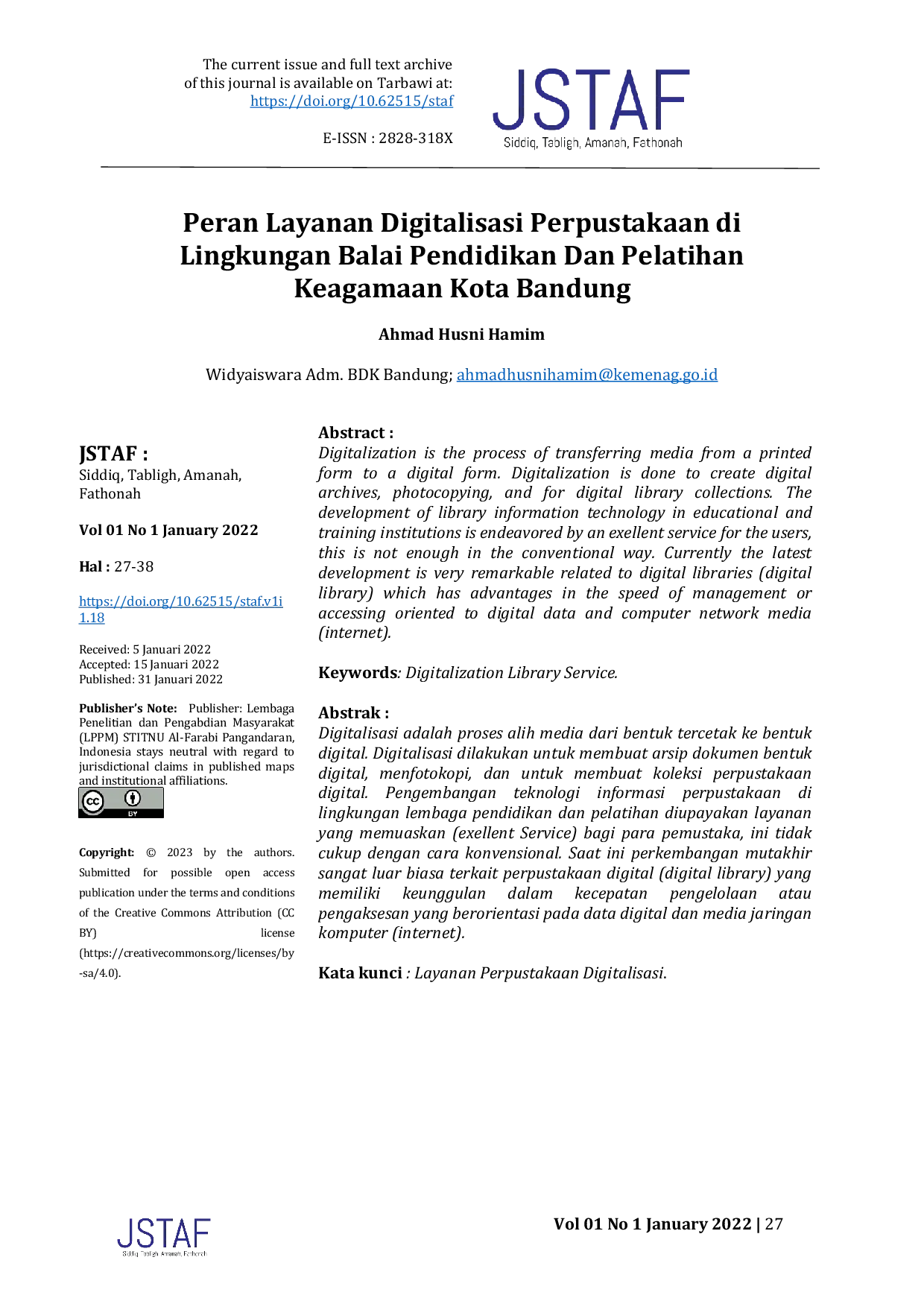 ALFARABIALFARABI Ke depan, perpustakaan di lingkungan Balai Diklat Keagamaan Kementerian Agama Kota Bandung perlu dilengkapi dengan sumber daya manusia yang profesional.Ke depan, perpustakaan di lingkungan Balai Diklat Keagamaan Kementerian Agama Kota Bandung perlu dilengkapi dengan sumber daya manusia yang profesional.