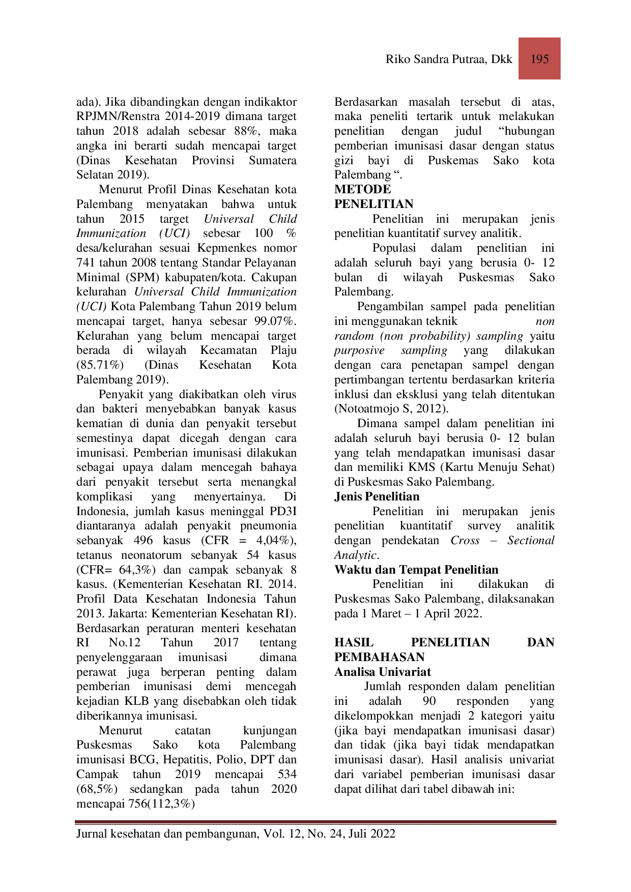 STIKESMITRAADIGUNASTIKESMITRAADIGUNA Hasil penelitian menunjukkan adanya hubungan antara pemberian imunisasi dasar dengan status gizi bayi usia 0-12 bulan di Puskesmas Sako Palembang denganHasil penelitian menunjukkan adanya hubungan antara pemberian imunisasi dasar dengan status gizi bayi usia 0-12 bulan di Puskesmas Sako Palembang dengan