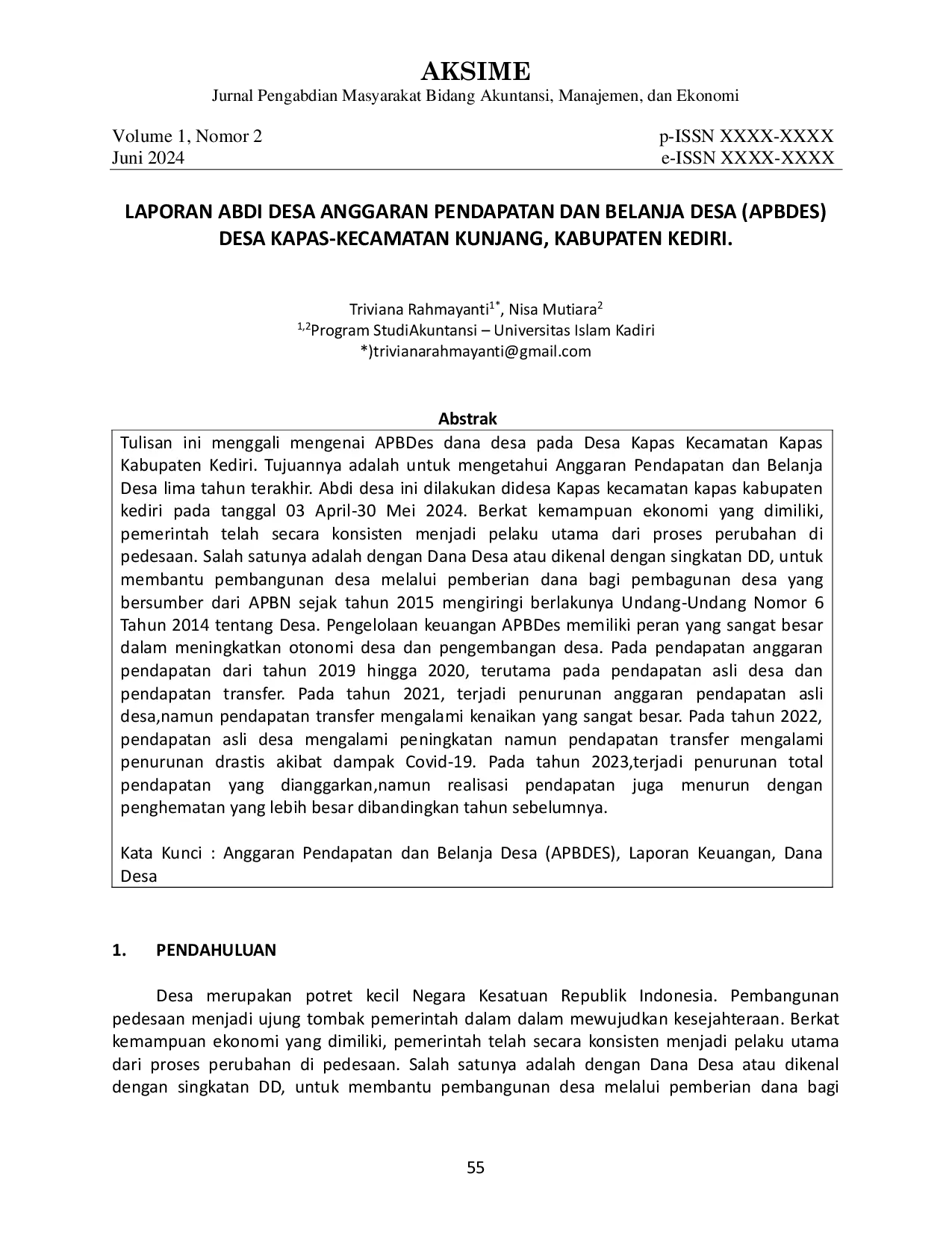 UNISKAUNISKA Tujuannya adalah untuk mengetahui Anggaran Pendapatan dan Belanja Desa lima tahun terakhir. Abdi desa ini dilakukan di desa Kapas kecamatan kapas kabupatenTujuannya adalah untuk mengetahui Anggaran Pendapatan dan Belanja Desa lima tahun terakhir. Abdi desa ini dilakukan di desa Kapas kecamatan kapas kabupaten