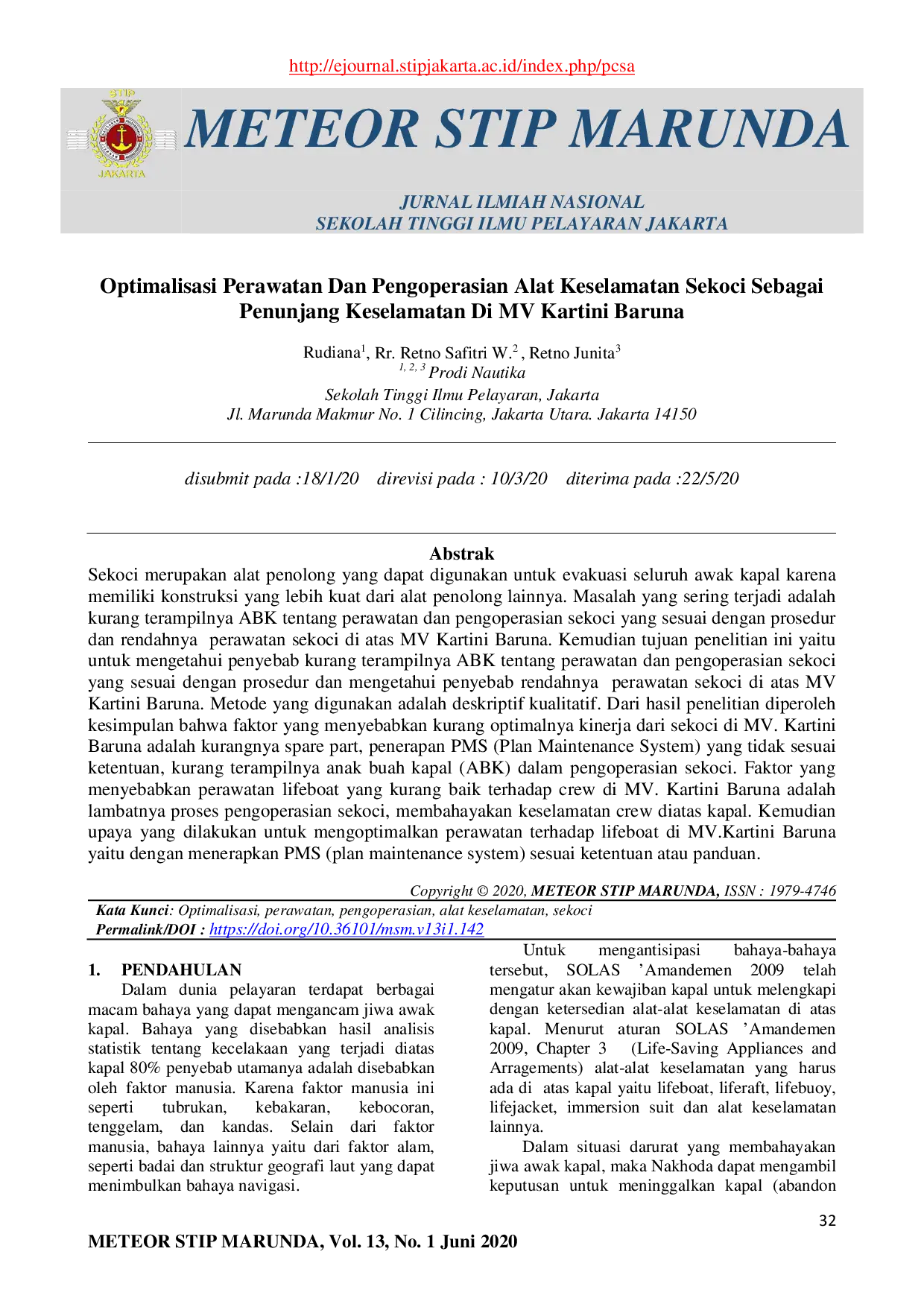 STIPJAKARTASTIPJAKARTA Faktor lainnya adalah proses pengoperasian sekoci yang lambat sehingga membahayakan keselamatan awak kapal. Upaya optimalisasi dilakukan dengan menerapkanFaktor lainnya adalah proses pengoperasian sekoci yang lambat sehingga membahayakan keselamatan awak kapal. Upaya optimalisasi dilakukan dengan menerapkan