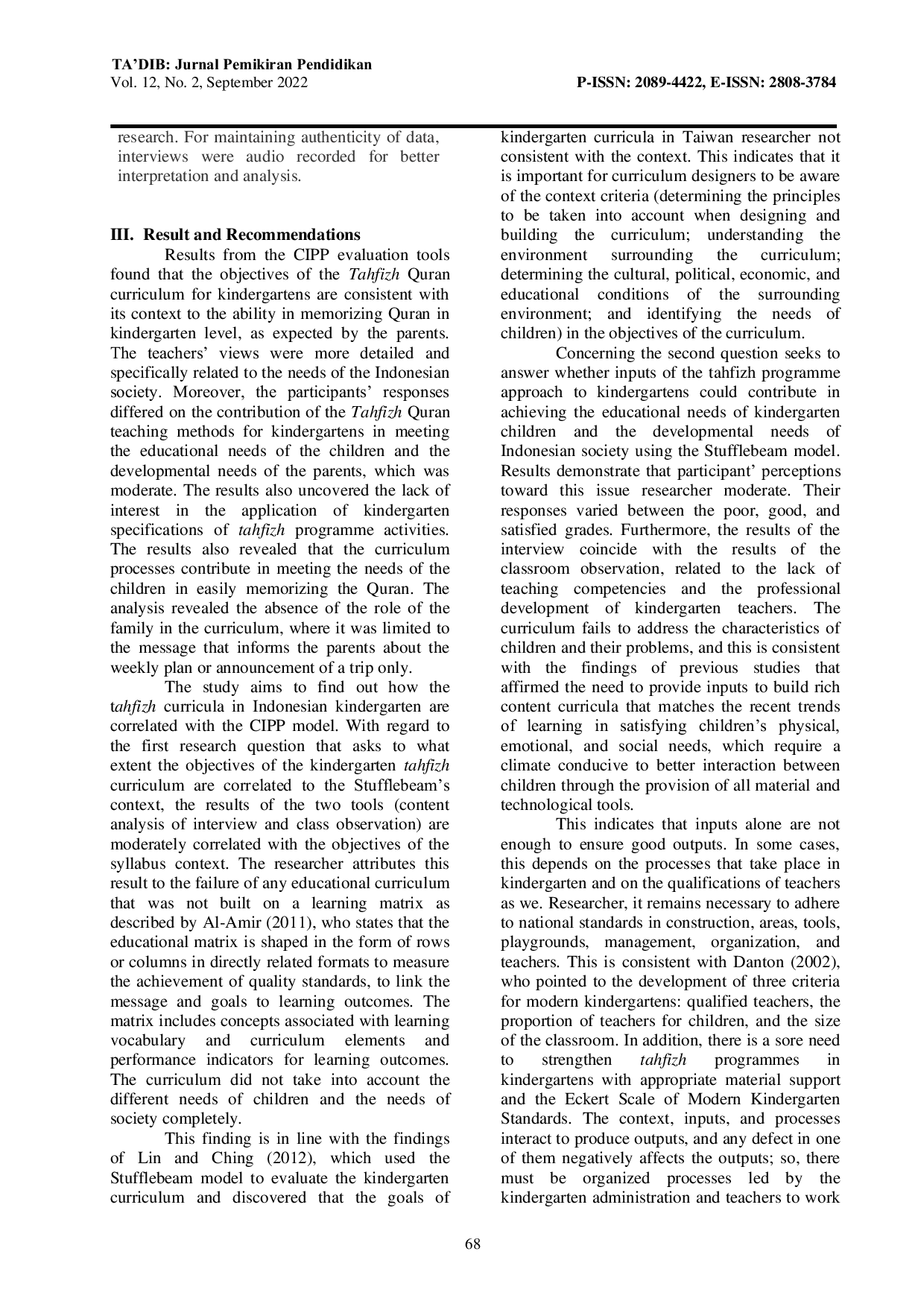 IAINTAKENGONIAINTAKENGON Penelitian ini bertujuan untuk mengevaluasi efektivitas implementasi program Pengajaran Tahfizh Quran untuk anak-anak taman kanak-kanak menggunakan ModelPenelitian ini bertujuan untuk mengevaluasi efektivitas implementasi program Pengajaran Tahfizh Quran untuk anak-anak taman kanak-kanak menggunakan Model