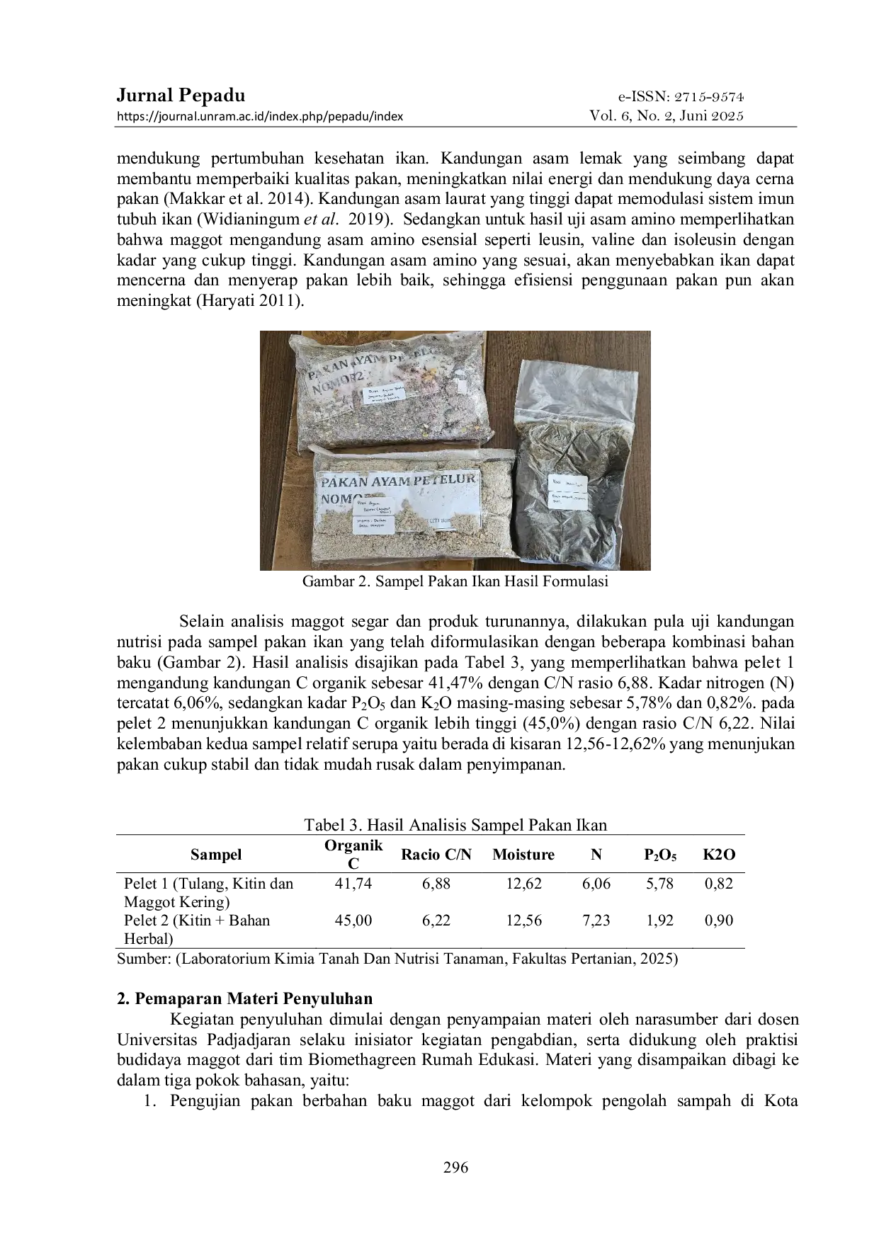 UNRAMUNRAM Hasil analisis menunjukkan bahwa kandungan nutrisi maggot memiliki potensi yang baik untuk dimanfaatkan sebagai bahan pakan. Diharapkan kegiatan ini dapatHasil analisis menunjukkan bahwa kandungan nutrisi maggot memiliki potensi yang baik untuk dimanfaatkan sebagai bahan pakan. Diharapkan kegiatan ini dapat